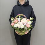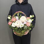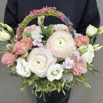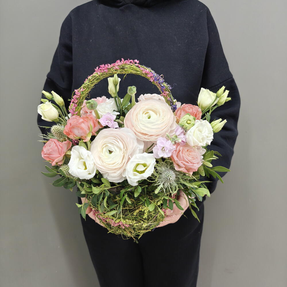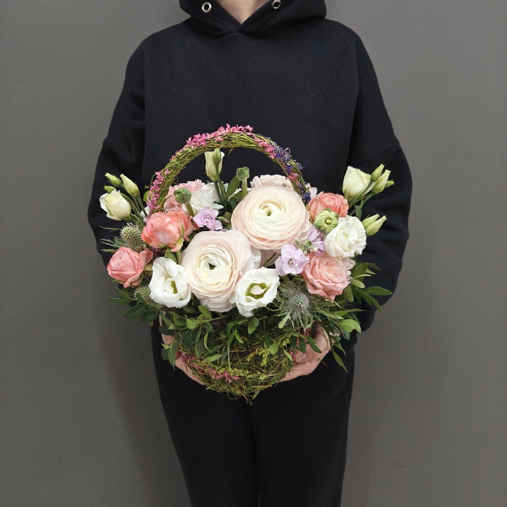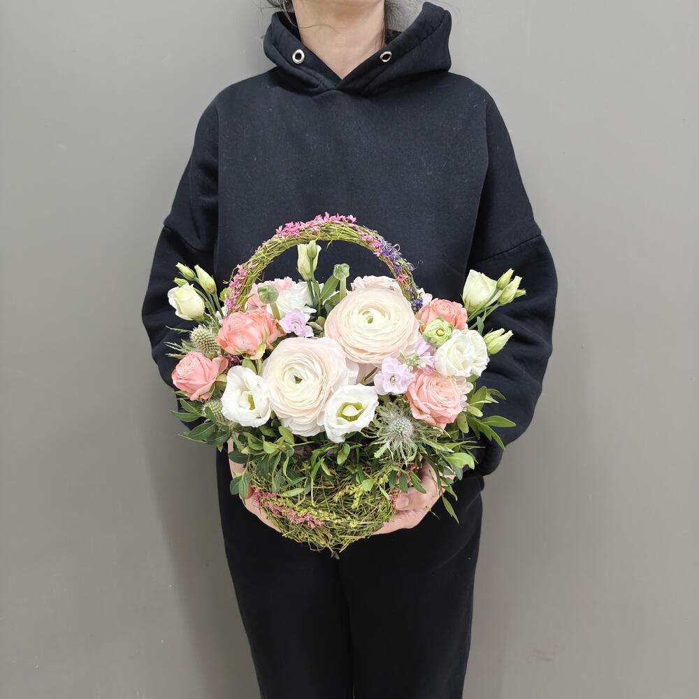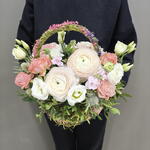 Корзина лесная с цветами ранункулюс, роза, эустома
