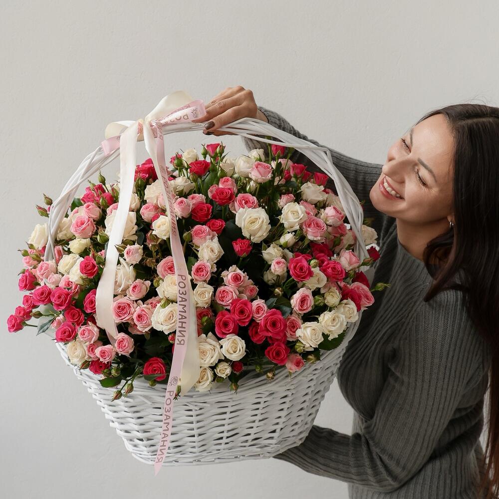 Роза кустовая - 51 шт. Корзина плетеная - 1 шт. Дизайнерская упаковка - 1 шт.