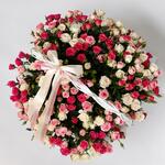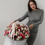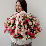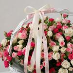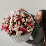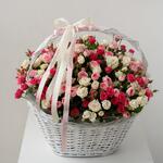 Шикарная корзина с кустовыми розами. В составе 51 кустовая роза. Размер корзины: Ширина 65 см Высота 50 см Чтобы цветы долго радовали своей красотой и свежестью, корзину надо поставить вдалеке от прямых солнечных лучей, сквозняков и отопительных приборов. Необходимо понемногу подливать воду по мере пересыхания флористической губки внутри корзины.