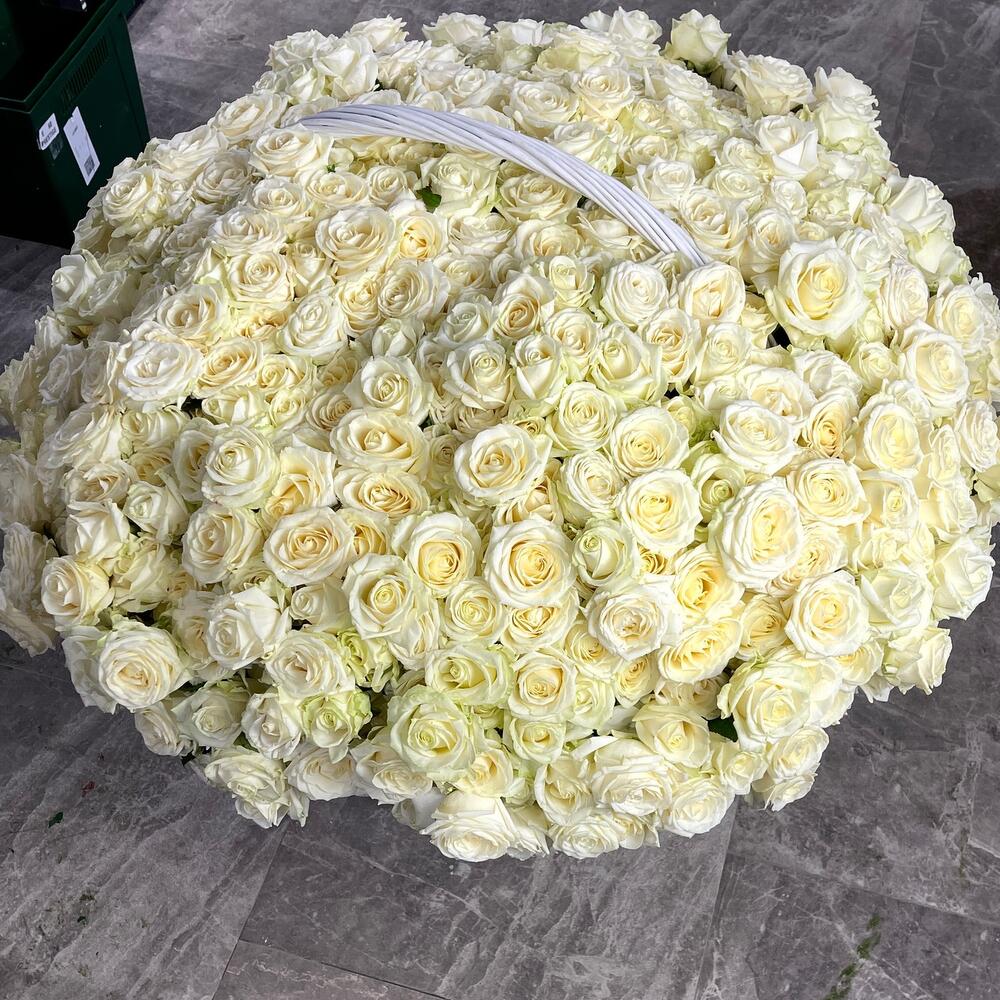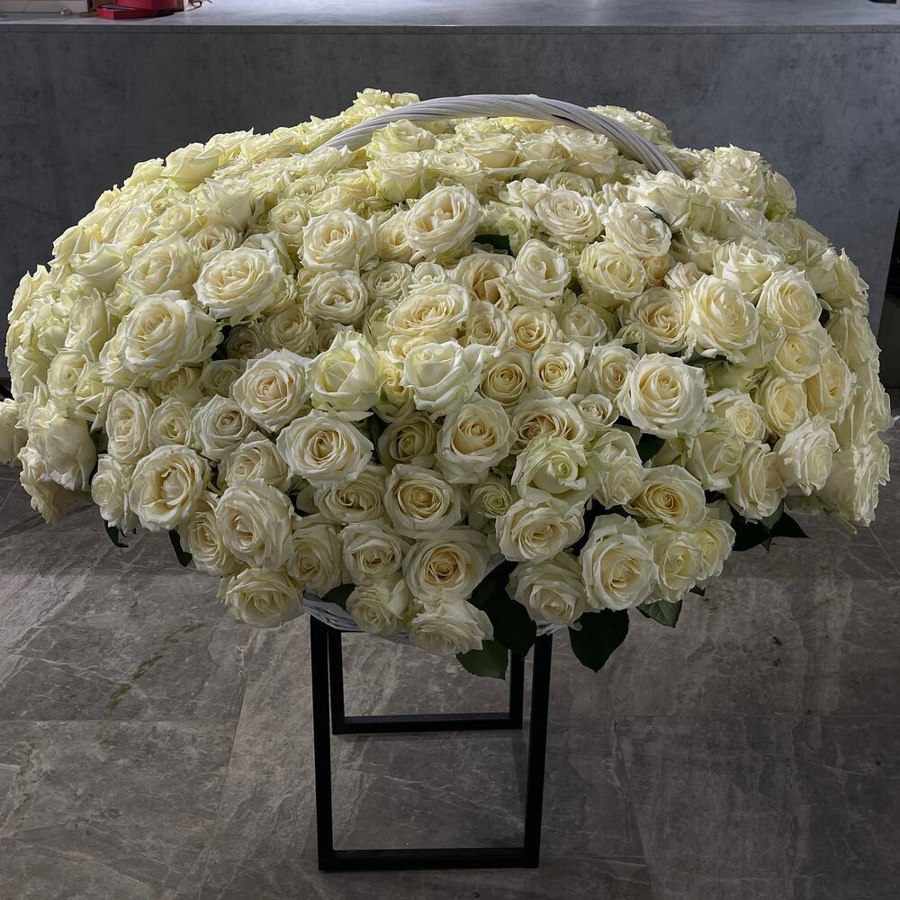 Роза - 301 шт. Корзина плетеная - 1 шт. Упаковка дизайнерская - 3 шт. Оазис флористический - 15 шт.