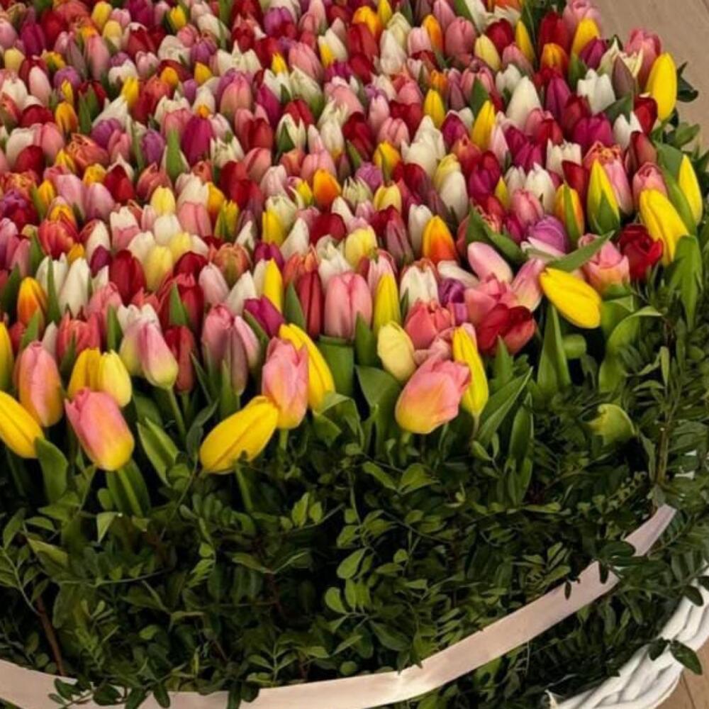 Лента атласная - 1 шт. Корзина плетеная - 1 шт. Открыточка с вашими пожеланиями - 1 шт. Губка флористическая - 1 шт. тюльпаны микс - 501 шт. настроение на весь день - 1000 шт. фисташка зелень пачка - 7 шт.