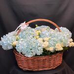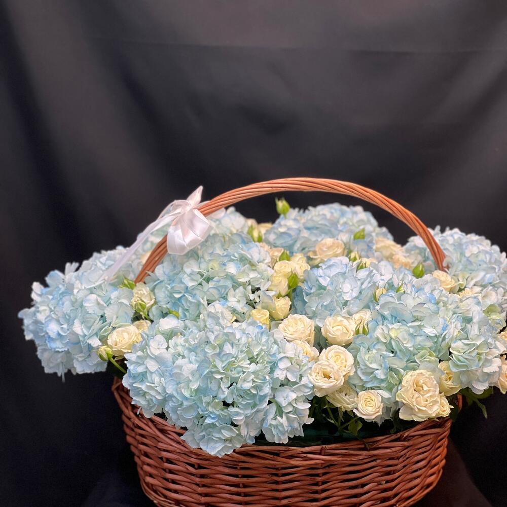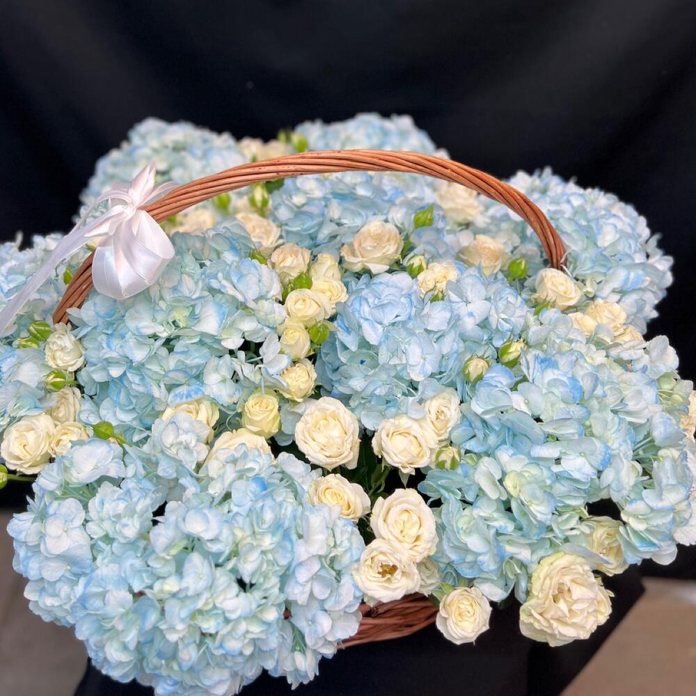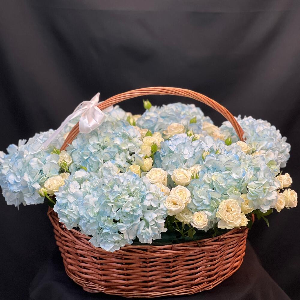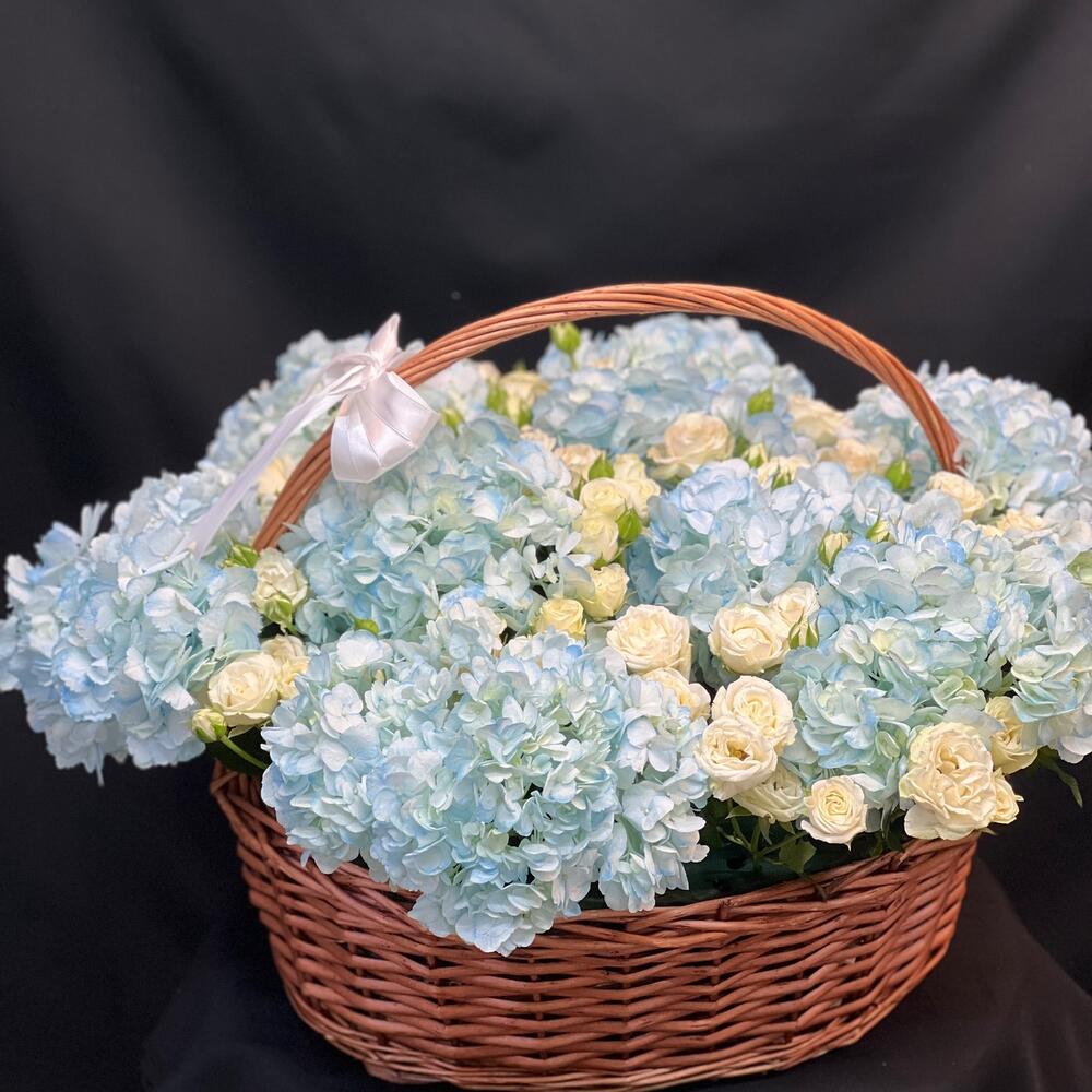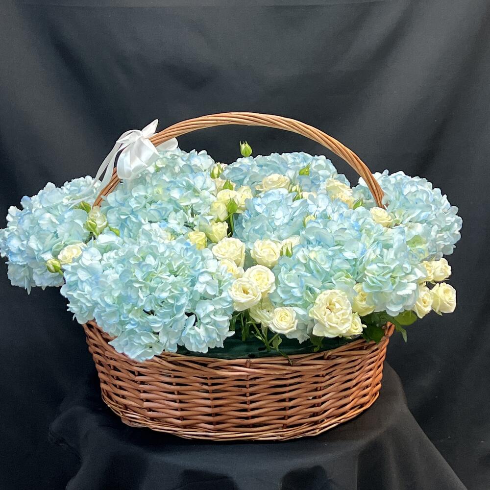 Корзина - 1 шт. Лента атласная - 1 шт. Кустовая белая роза - 10 шт. губка флористическая с водой - 4 шт. гортензии синие - 9 шт.