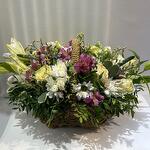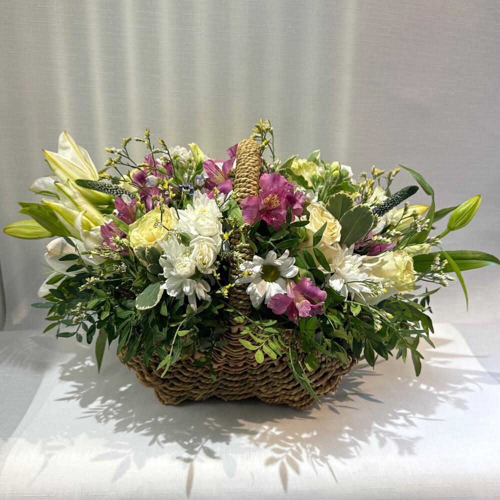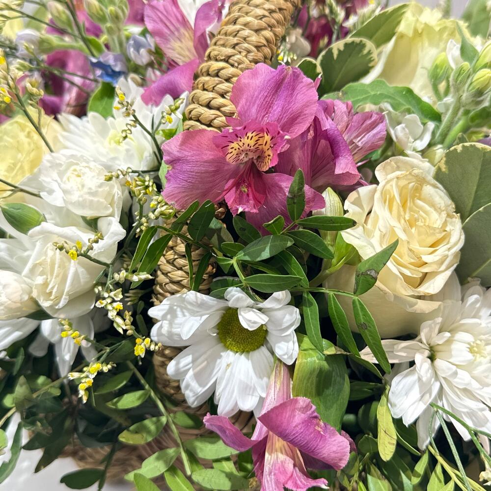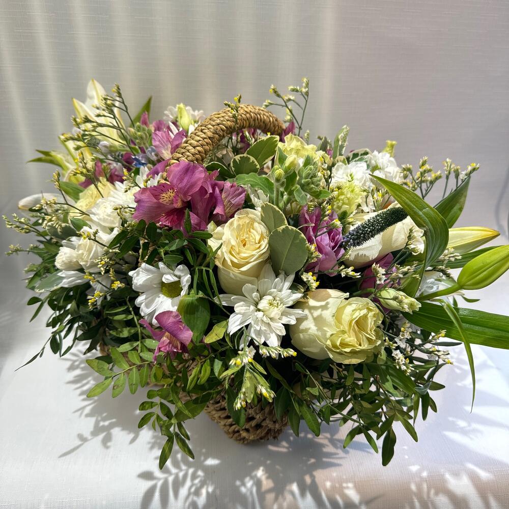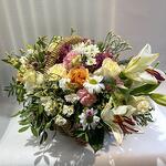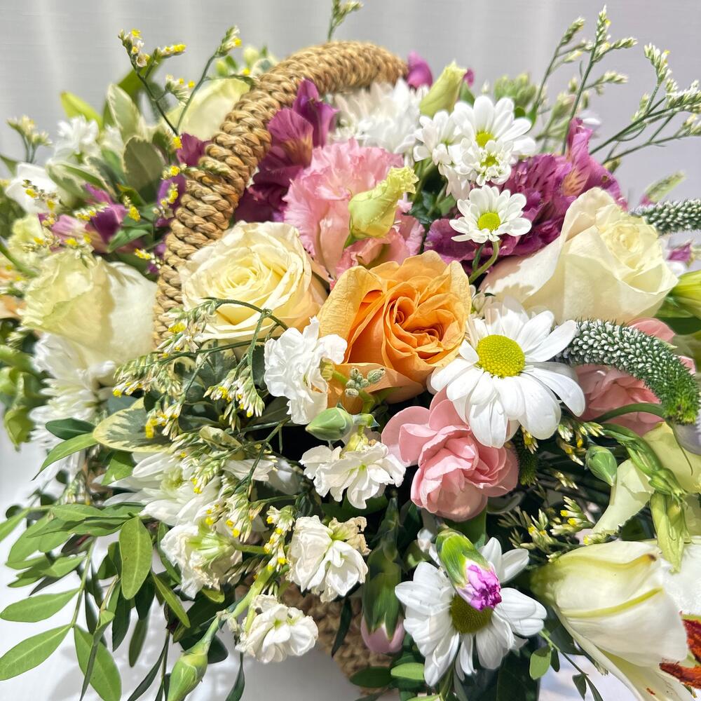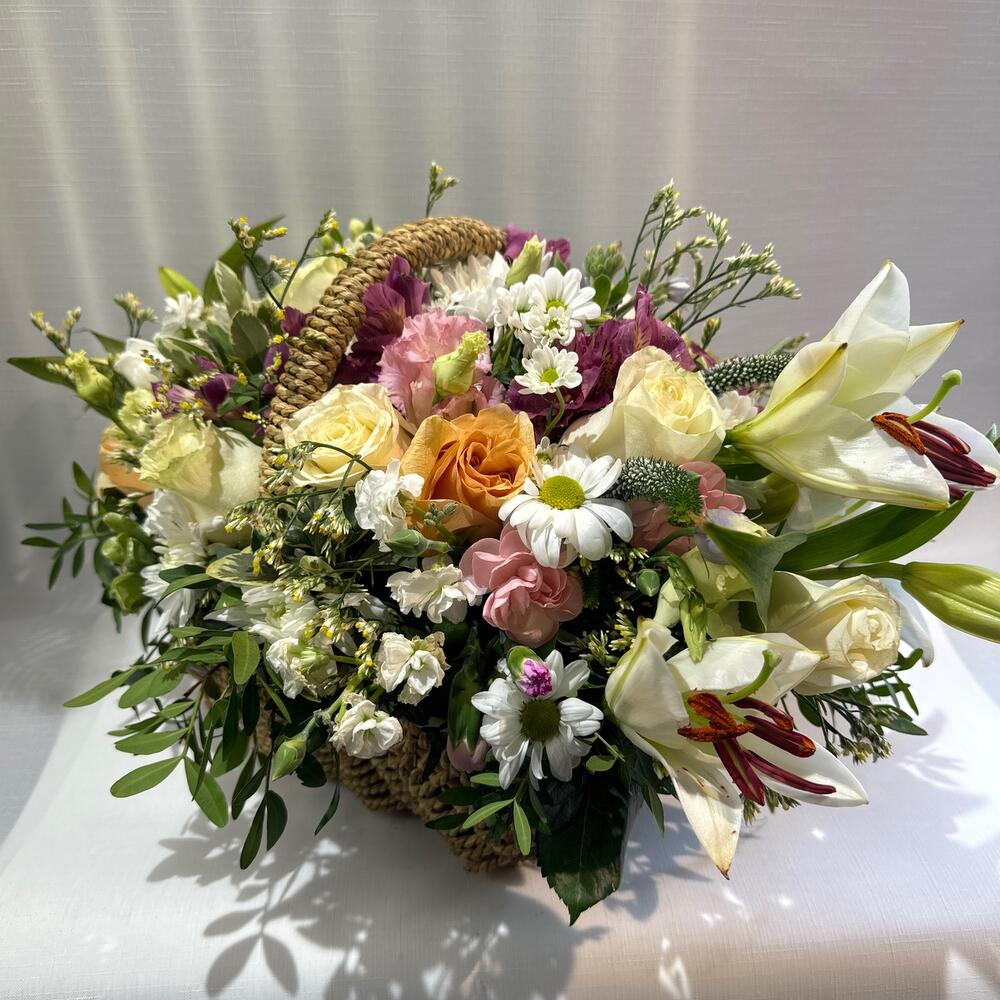 Альстромерия - 8 шт. Вероника - 3 шт. Лилия - 4 шт. Лимониум - 11 шт. Писташ - 8 шт. Питтоспорум - 3 шт. Хризантема кустовая - 11 шт. Эустома - 7 шт. Диантус - 9 шт. Кустовая гвоздика - 4 шт. Оксипеталум - 2 шт. Корзина плетеная - 1 шт. Роза Мондиаль - 11 шт. Оазис флористический - 1 шт.