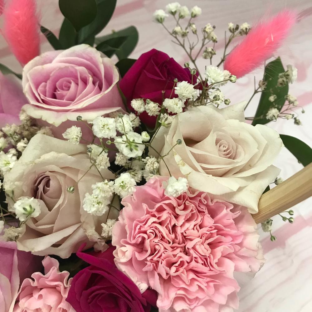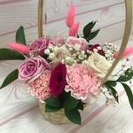 Гипсофила - 1 шт. Корзина - 1 шт. Рускус - 4 шт. Диантус - 2 шт. Роза Кенийская - 7 шт. Оазис флористический - 1 шт.