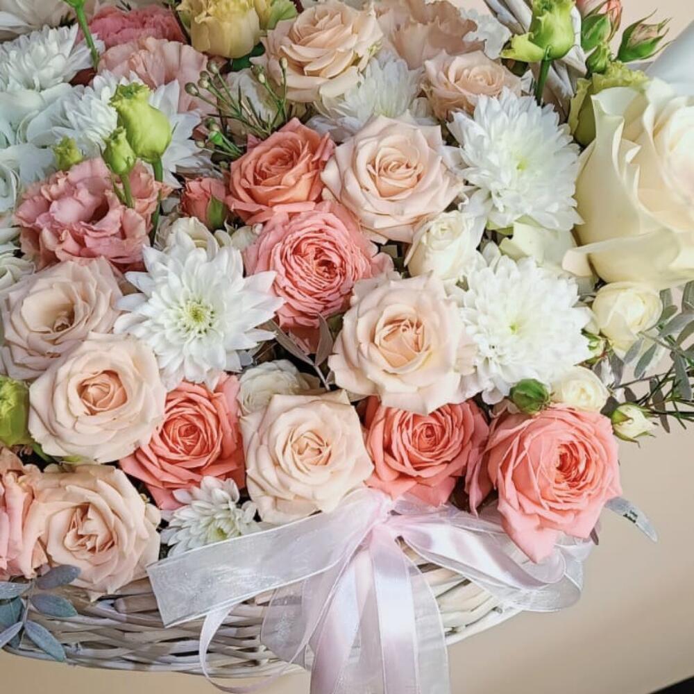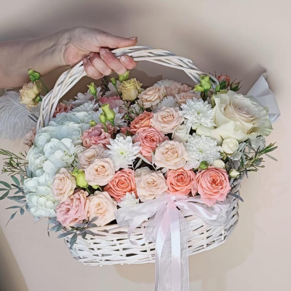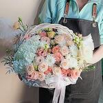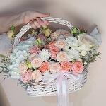 Альстромерия - 2 шт. Гортензия - 1 шт. Писташ - 3 шт. Кустовая роза - 5 шт. Кустовая хризантема - 2 шт. Роза одноголовая - 1 шт. Гвоздика - 1 шт. Эустома - 1 шт. перо декоративное - 1 шт.