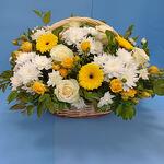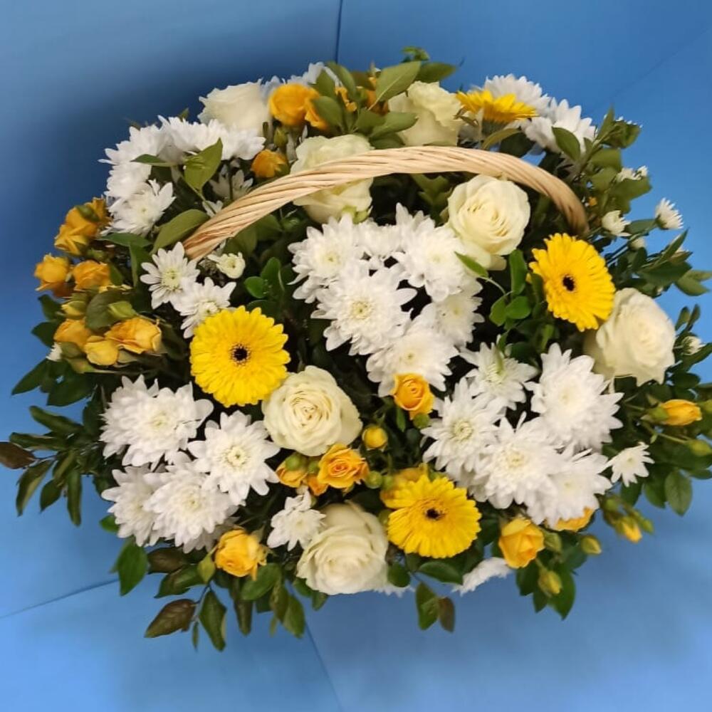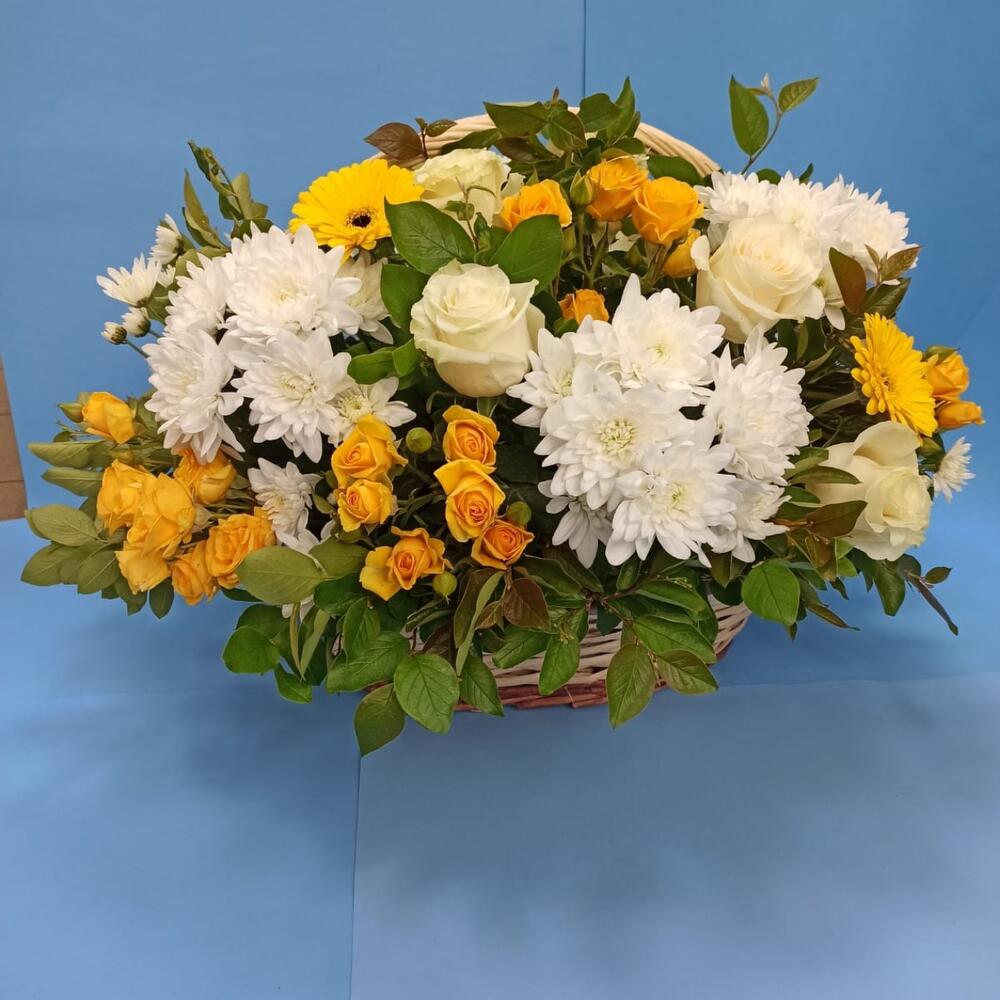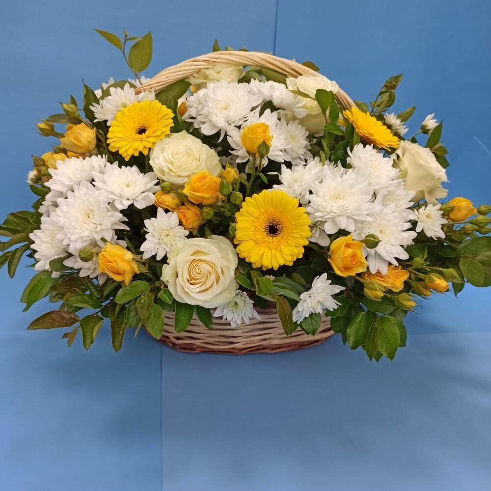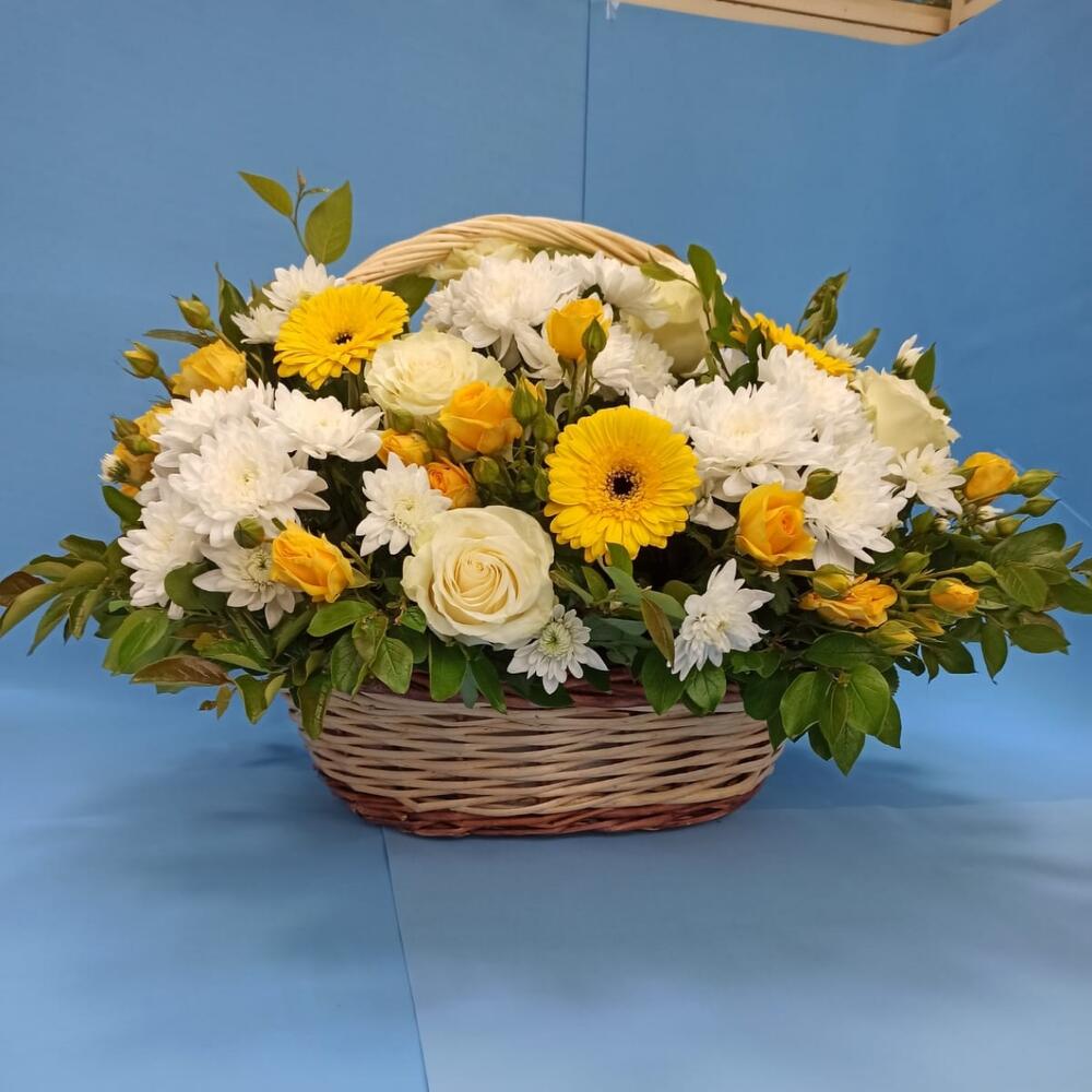 Корзина - 1 шт. Роза кустовая - 5 шт. Гербера - 5 шт. Роза белая - 5 шт. Хризантема кустовая Белая - 5 шт. Оазис флористический - 2 шт. фисташка зелень - 7 шт.