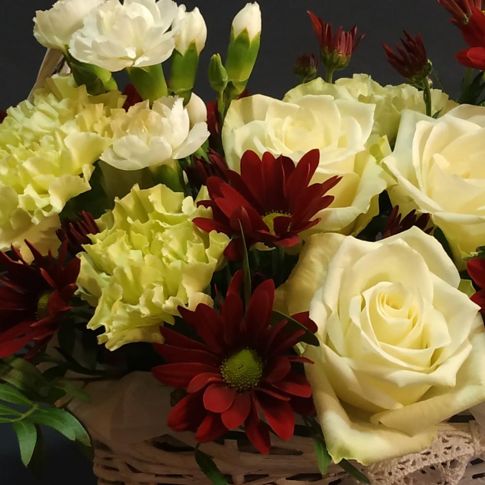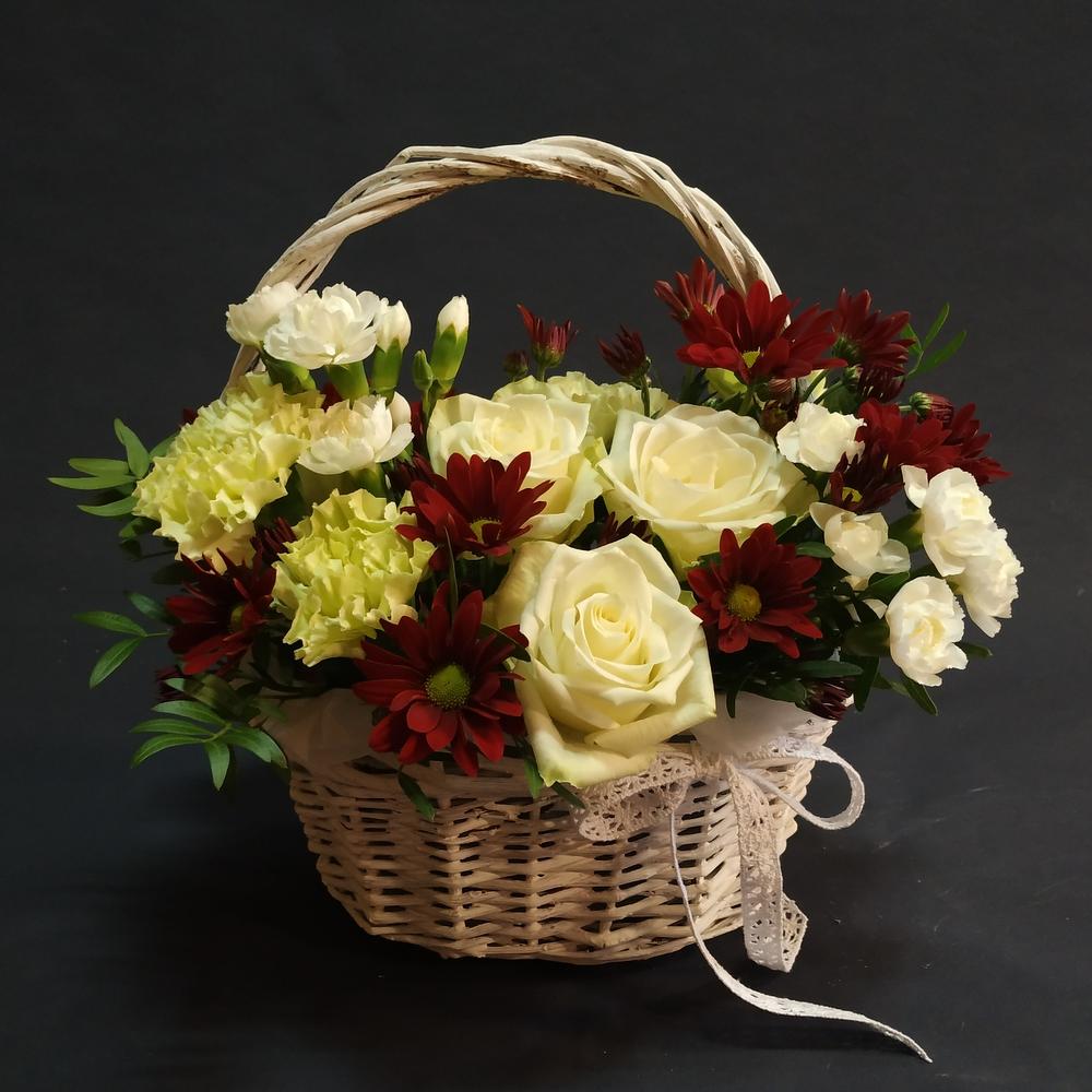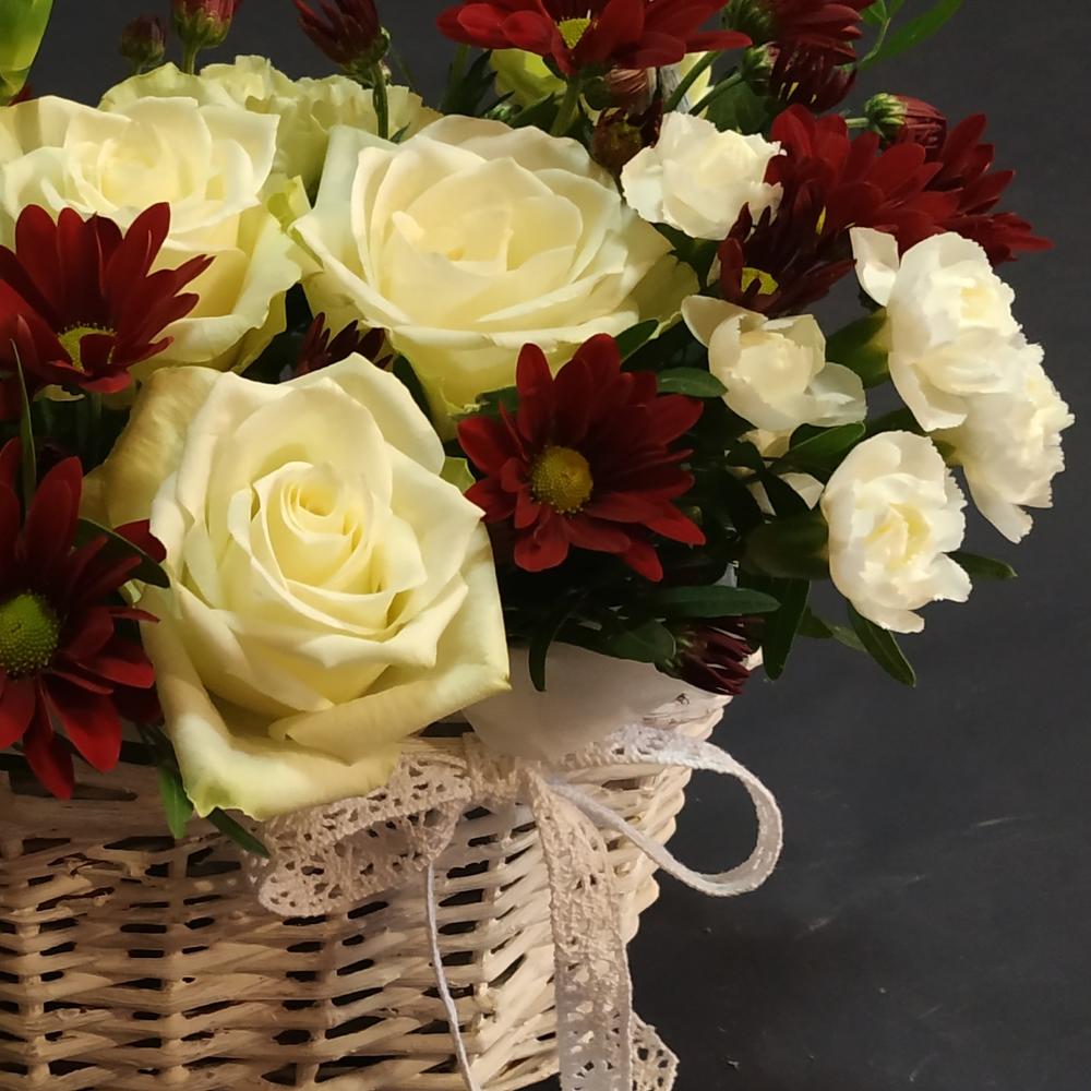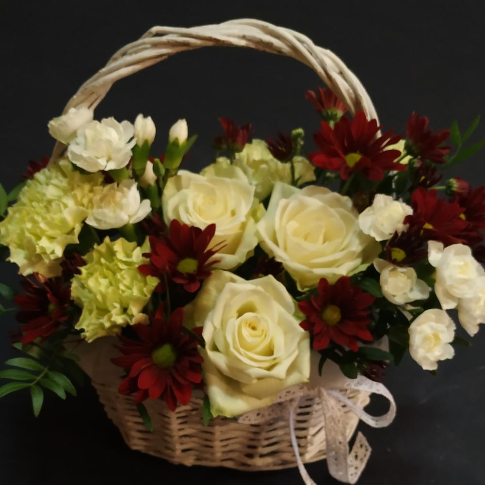 Хризантема кустовая - 3 шт. Роза - 5 шт. Диантус - 4 шт. Корзина плетеная - 1 шт. Диантус кустовой - 3 шт. зелень фисташка - 3 шт.