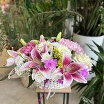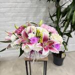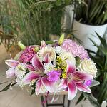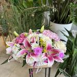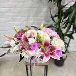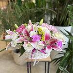 Танацетум - 1 шт. Хризантема кустовая - 2 шт. Роза одноголовая - 3 шт. Гербера - 1 шт. Роза пионовидная - 1 шт. Лилия Розовая - 1 шт. Корзина плетеная - 1 шт. Гортензия розовая - 1 шт. Статица желтая - 1 шт.