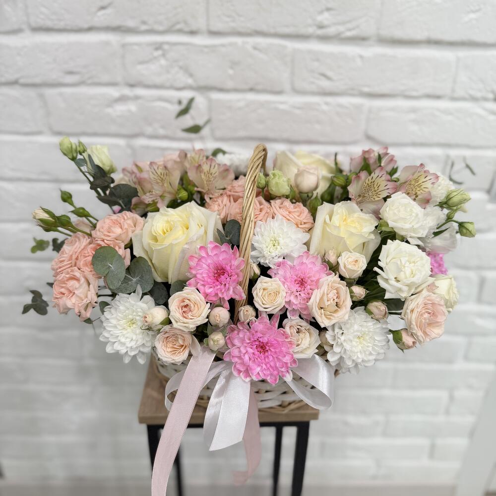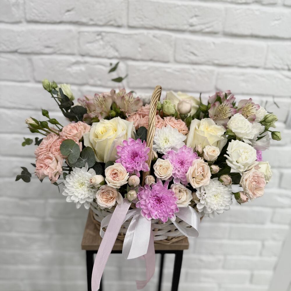 Альстромерия - 3 шт. Роза кустовая - 7 шт. Хризантема кустовая - 2 шт. Эвкалипт - 4 шт. Эустома - 1 шт. Лента атласная - 2 шт. Роза пионовидная - 3 шт. Корзина плетеная с оазисом - 1 шт.