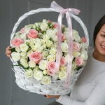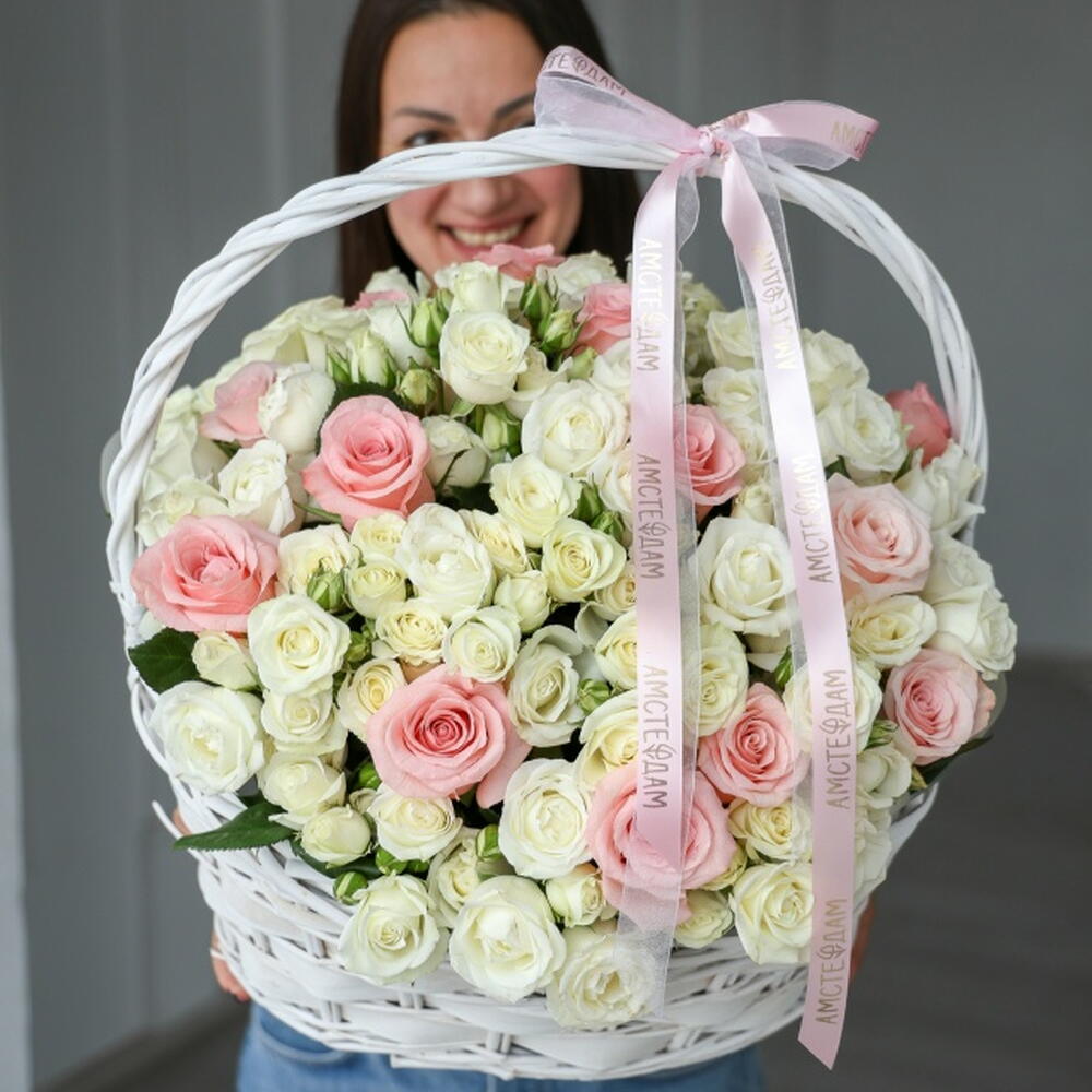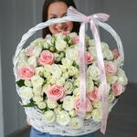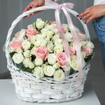 Роза - 25 шт. Кустовая роза - 35 шт. Лента атласная - 2 шт. Корзина плетеная - 1 шт. Оазис флористический - 3 шт.