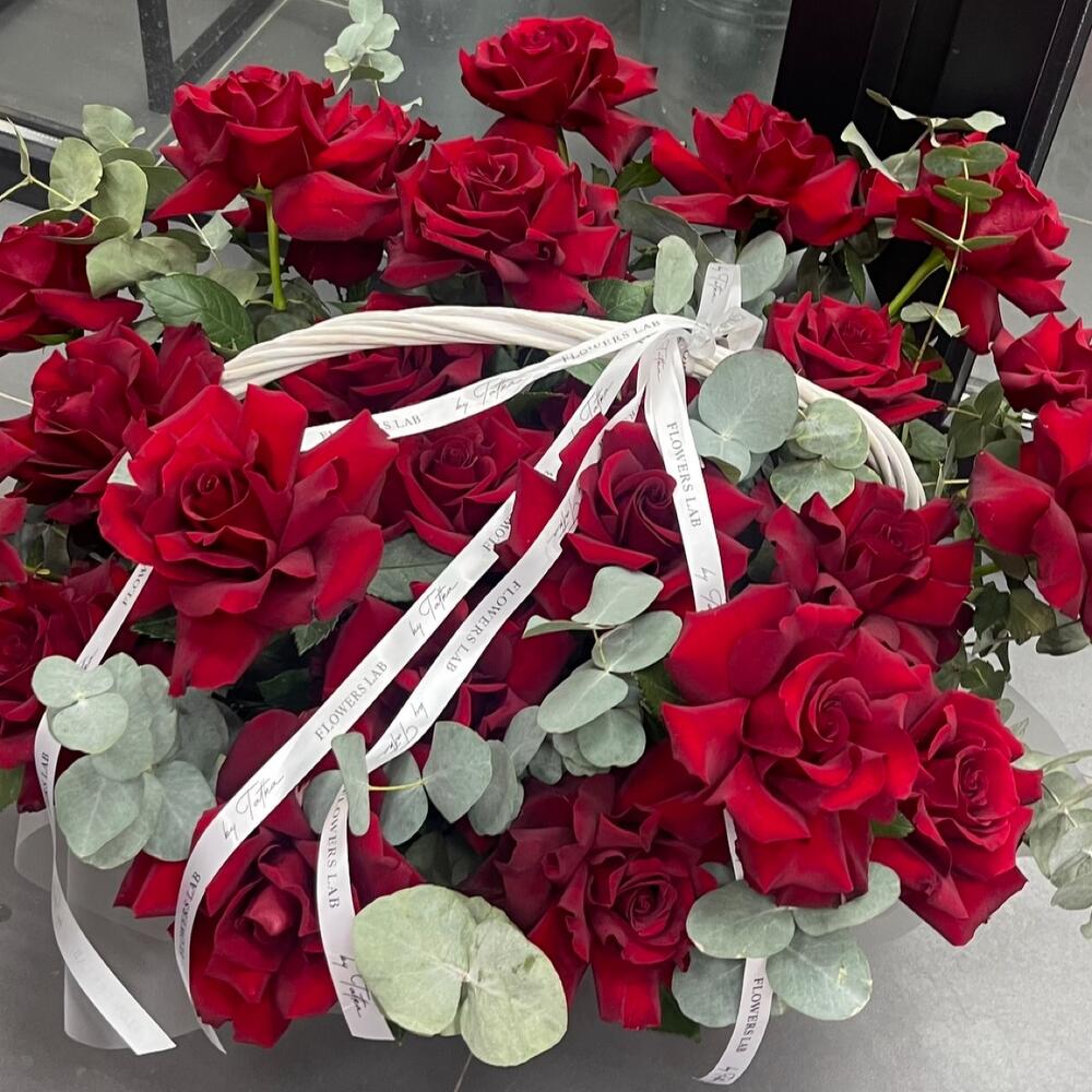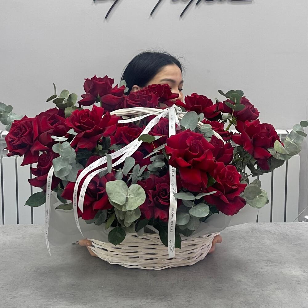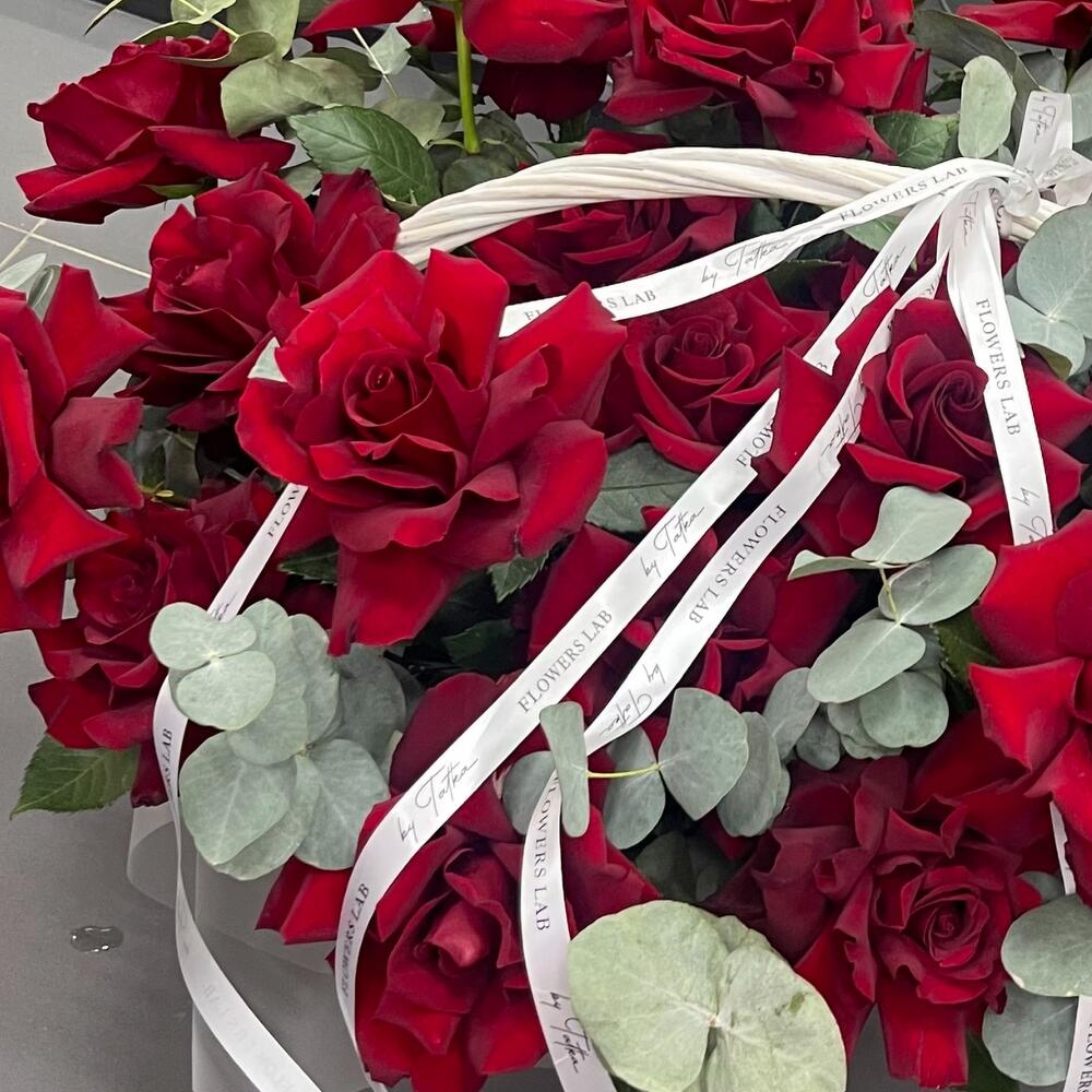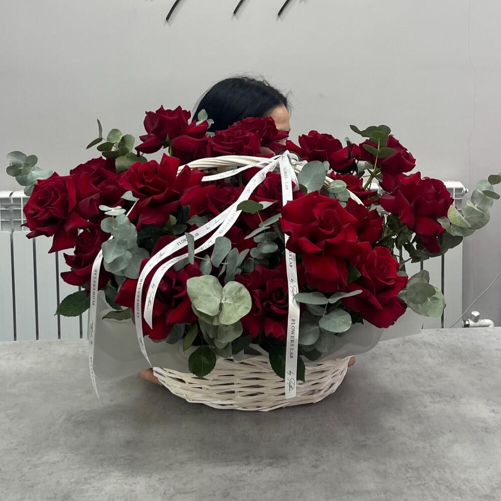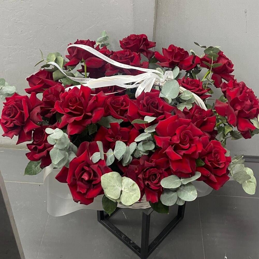 Лента атласная - 2 шт. Корзина плетеная - 1 шт. Оазис флористический - 4 шт. Эвкалипт Baby Blue - 10 шт. Эксплорер 60 см - 25 шт.