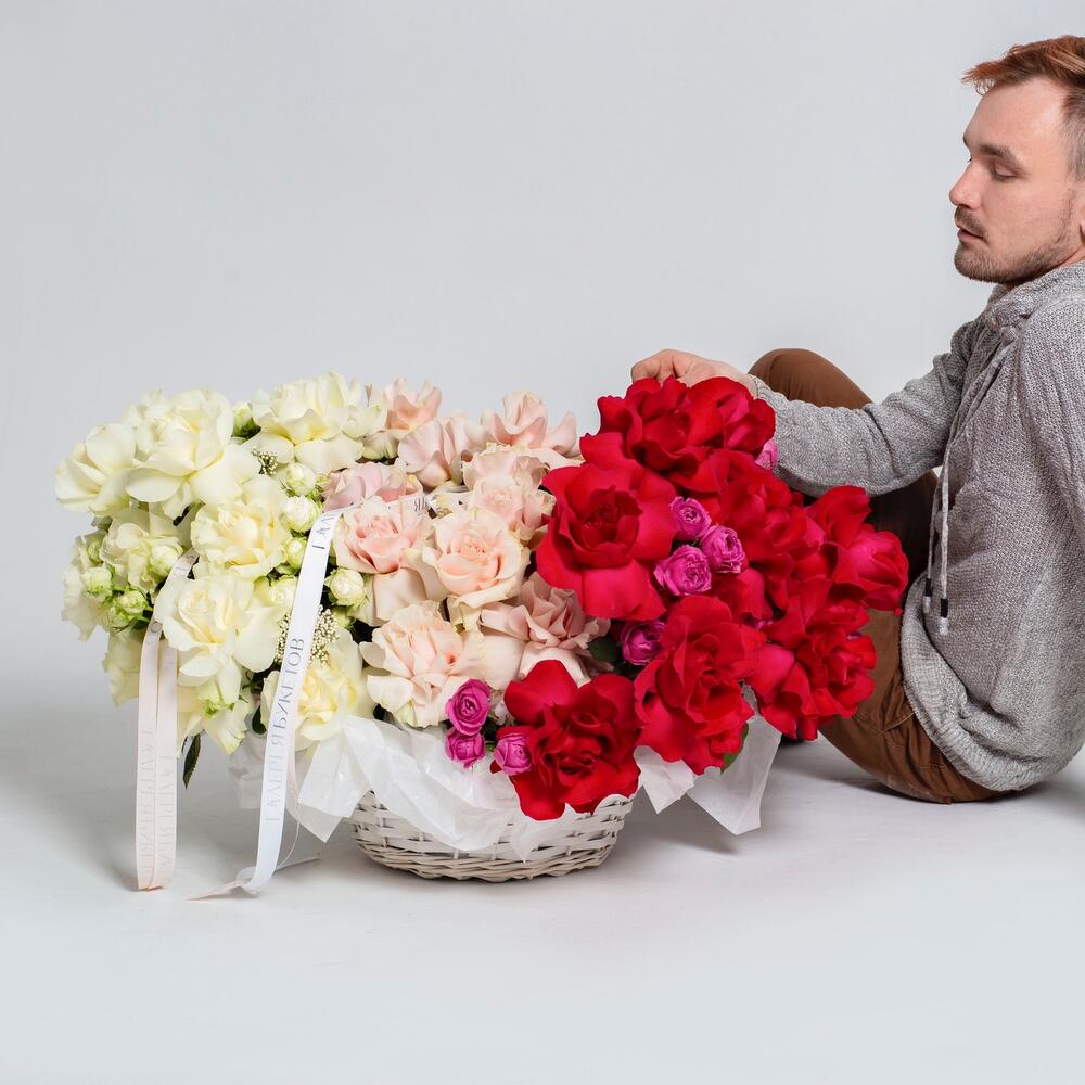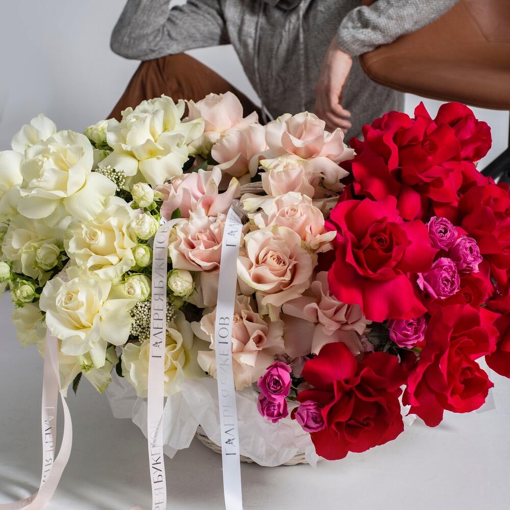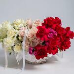 Гортензия - 5 шт. Роза кустовая пионовидная - 19 шт. Корзина плетеная - 1 шт. Оазис флористический - 4 шт. роза кружевная - 51 шт.