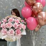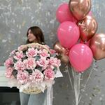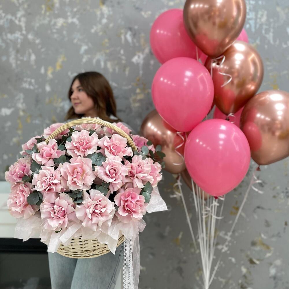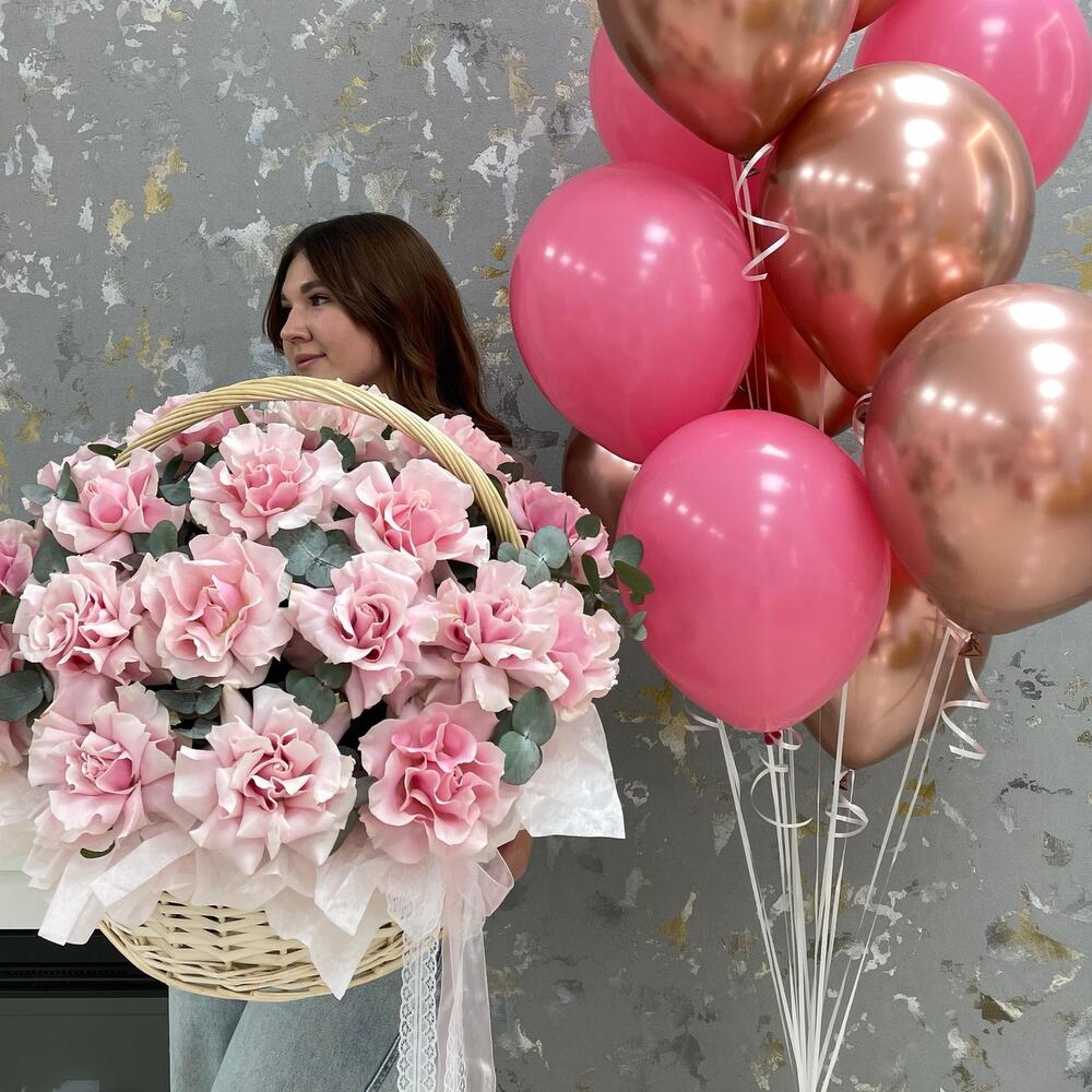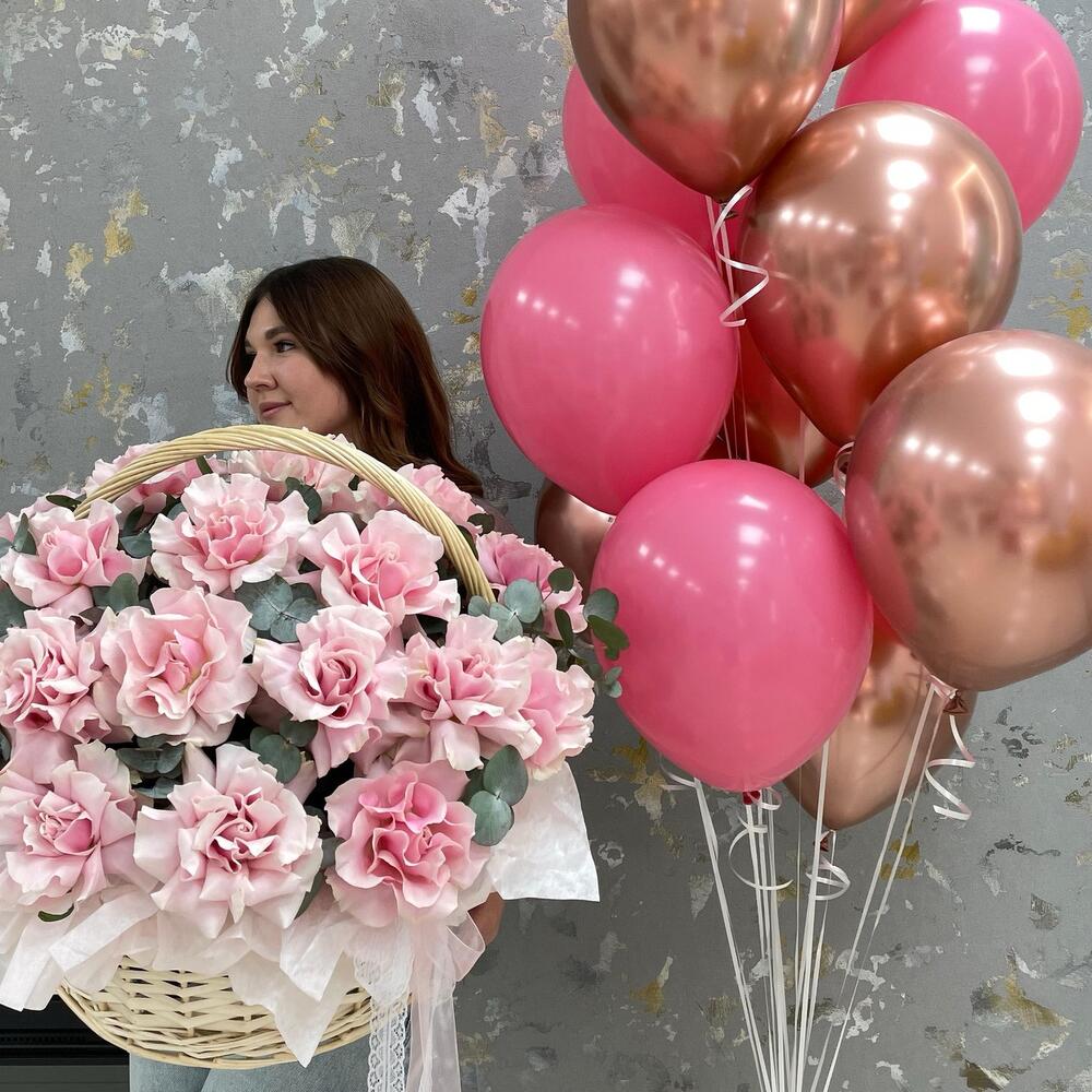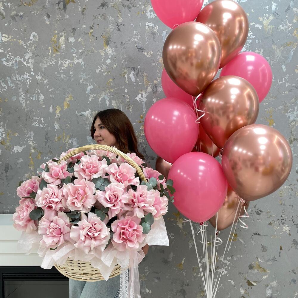 Корзина с цветами и набор шаров «С Праздником , Любимая!» из роз