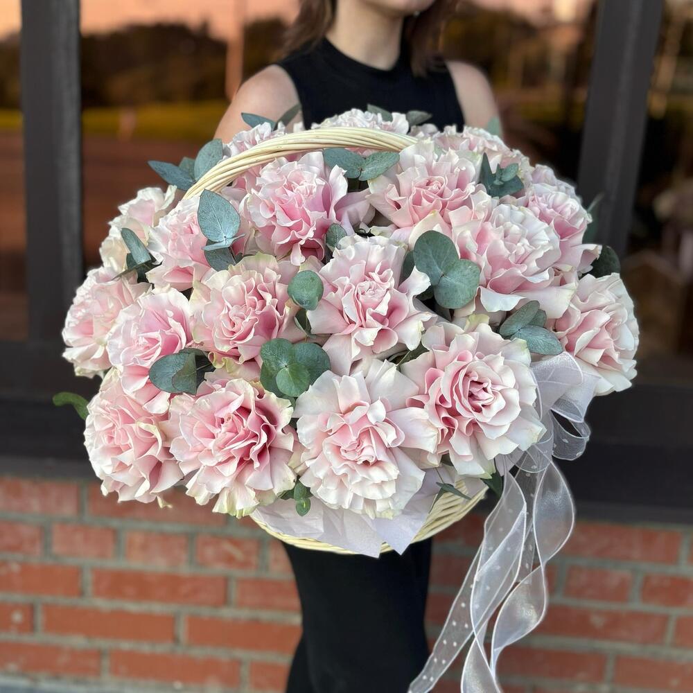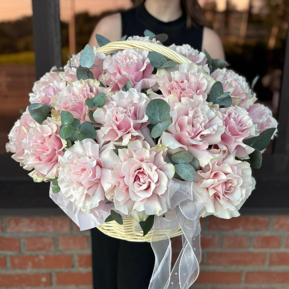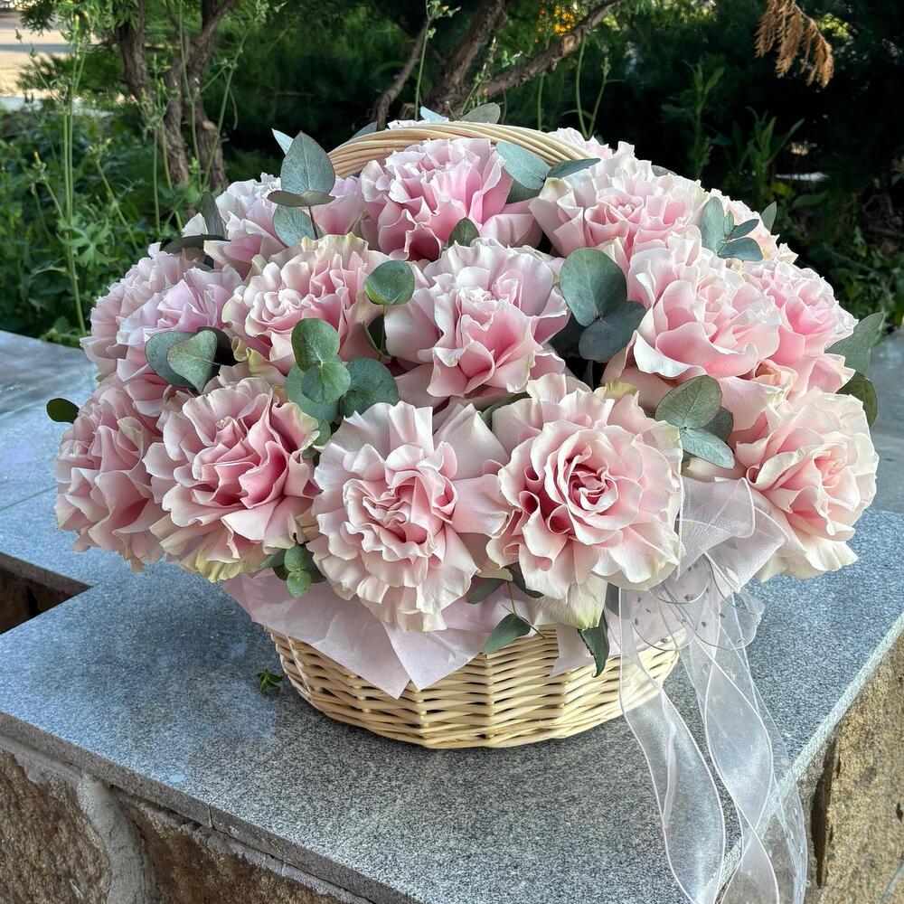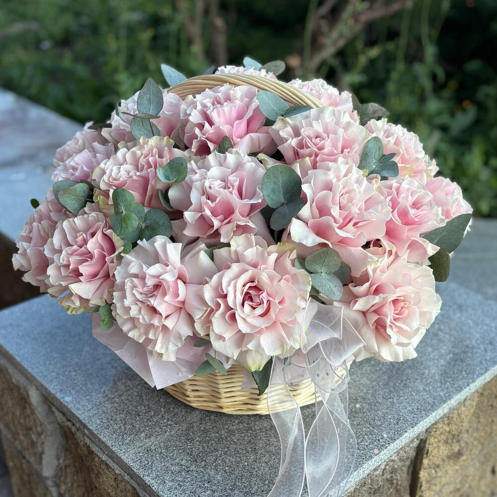 Эвкалипт - 4 шт. Роза - 25 шт. Корзина плетеная - 1 шт. Открыточка с вашими пожеланиями - 1 шт. Оазис флористический - 1 шт. Средство для продления жизни цветов - 1 шт. инструкция по уходу за цветами - 1 шт.