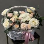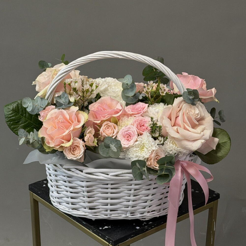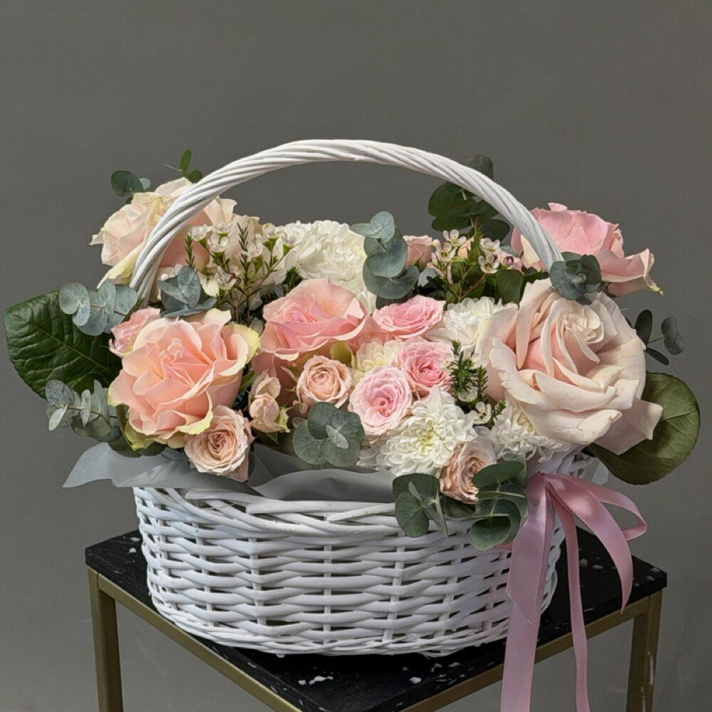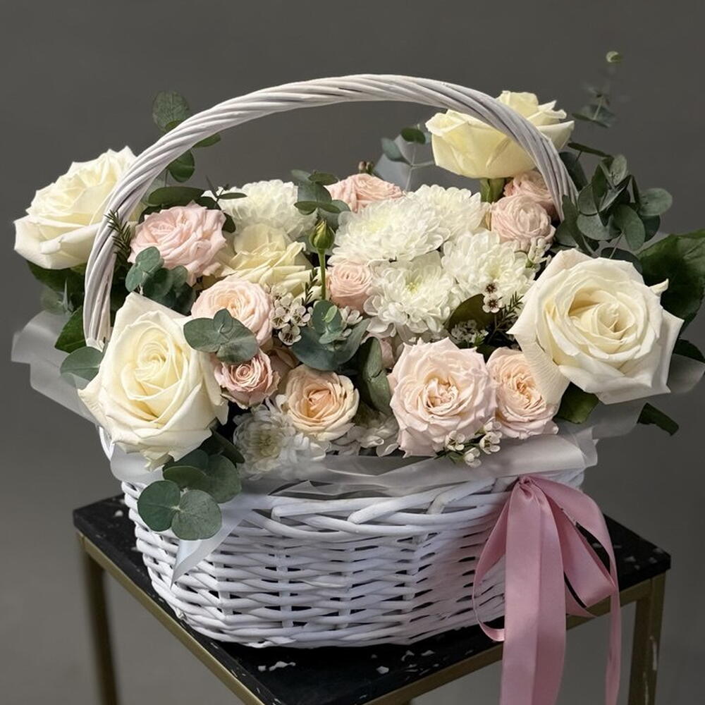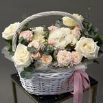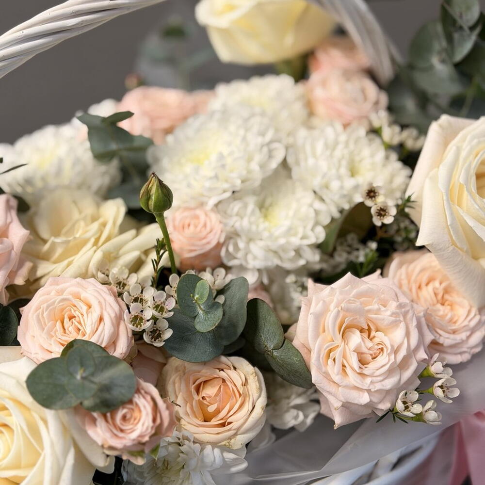 Хризантема кустовая - 2 шт. Кустовая роза - 5 шт. Лента атласная - 2 шт. Корзина плетеная - 1 шт. Роза французская - 5 шт. Эвкалипт Микс - 3 шт. Оазис флористический - 1 шт. Хамелациум Белый - 1 шт.