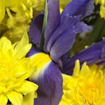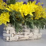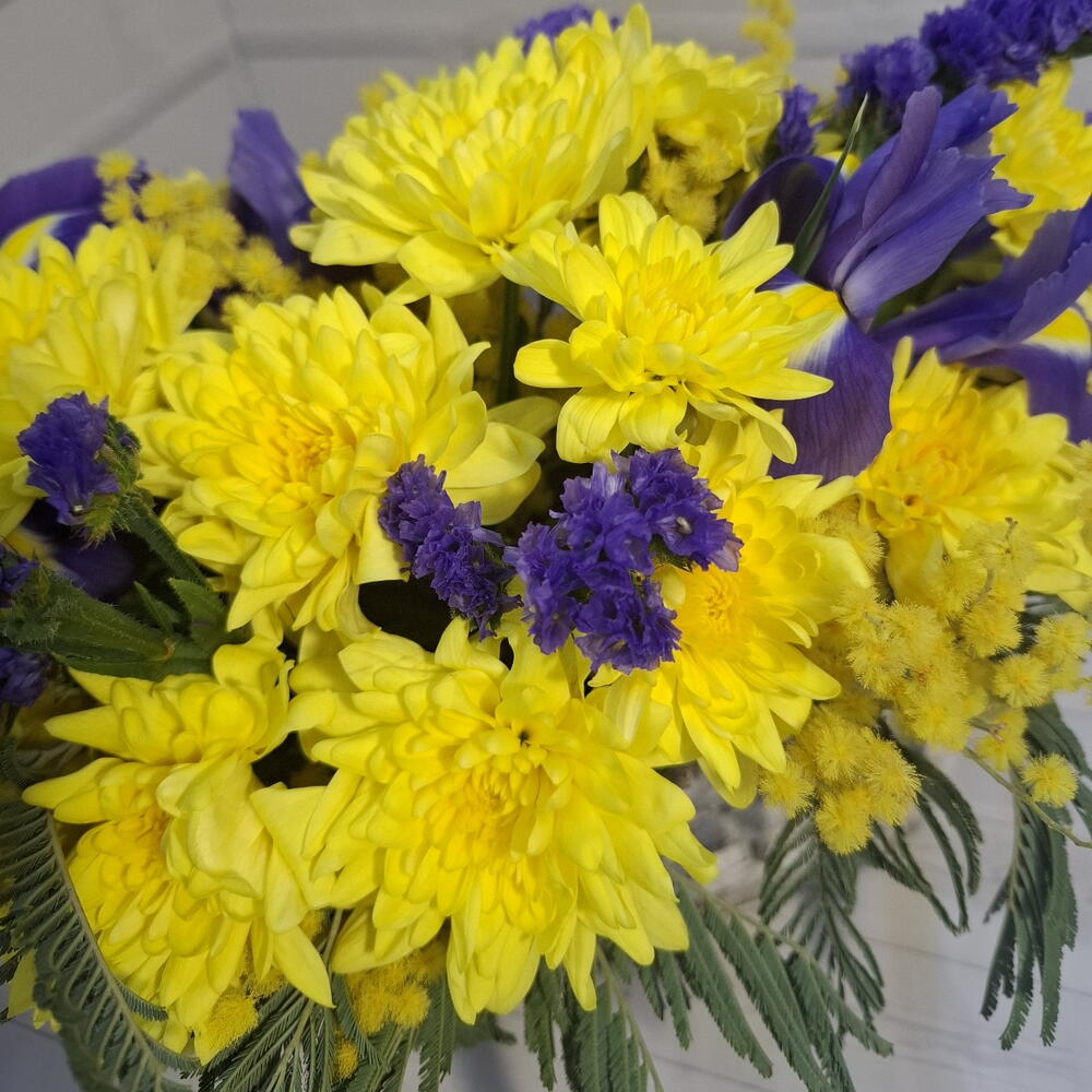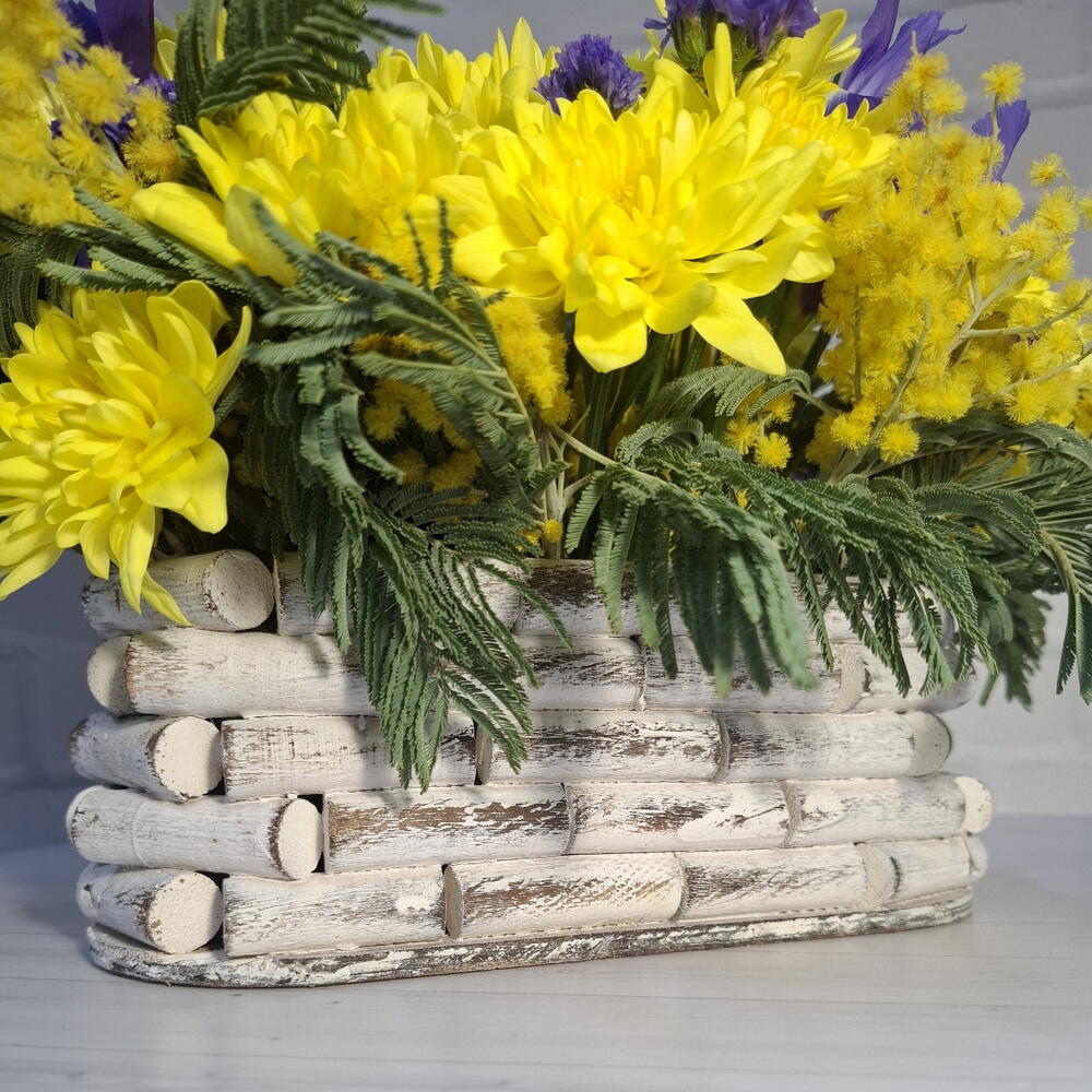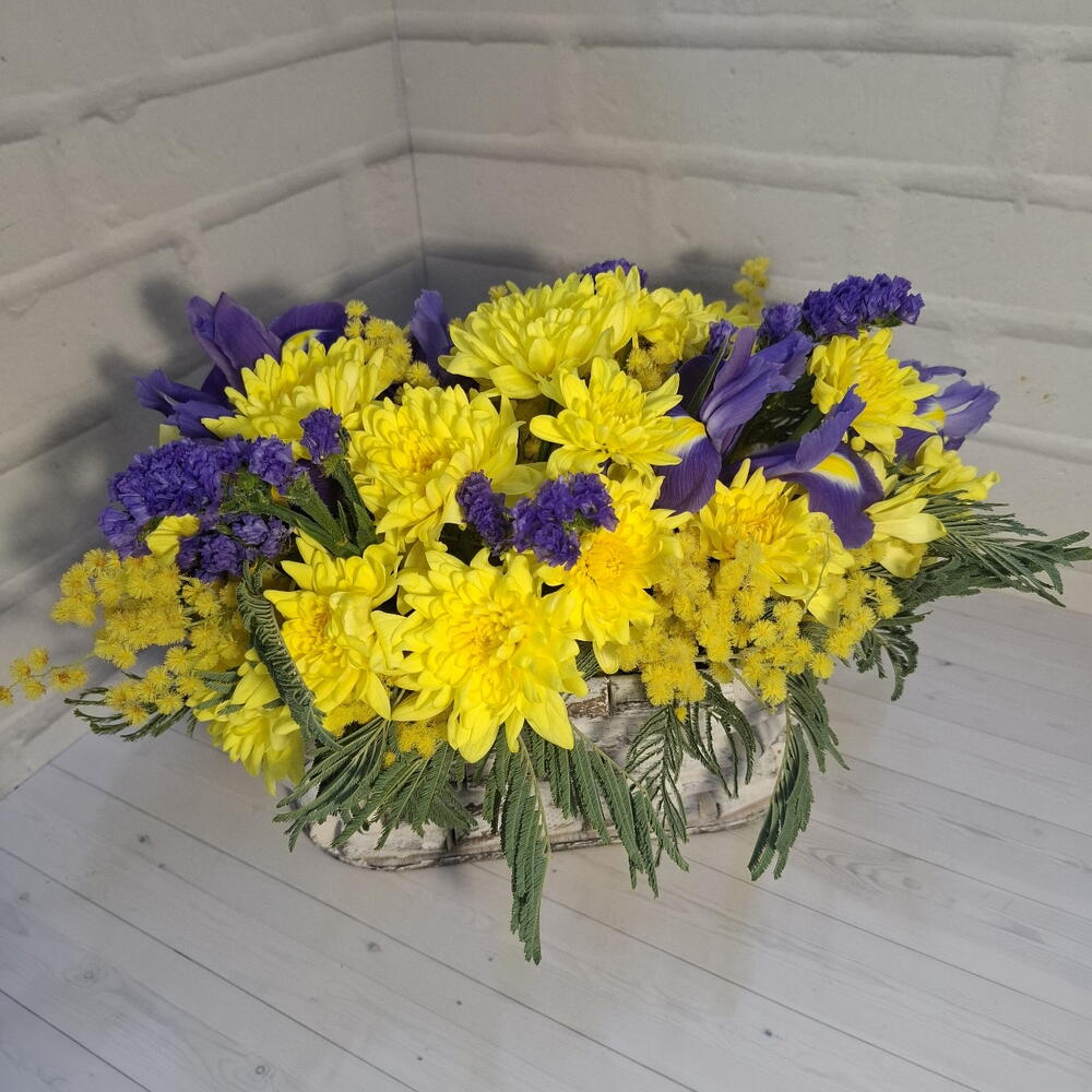 Ирис - 4 шт. Мимоза - 4 шт. Статица - 3 шт. Хризантема кустовая - 6 шт. корзина деревянная с оазисом - 1 шт.