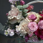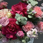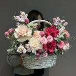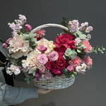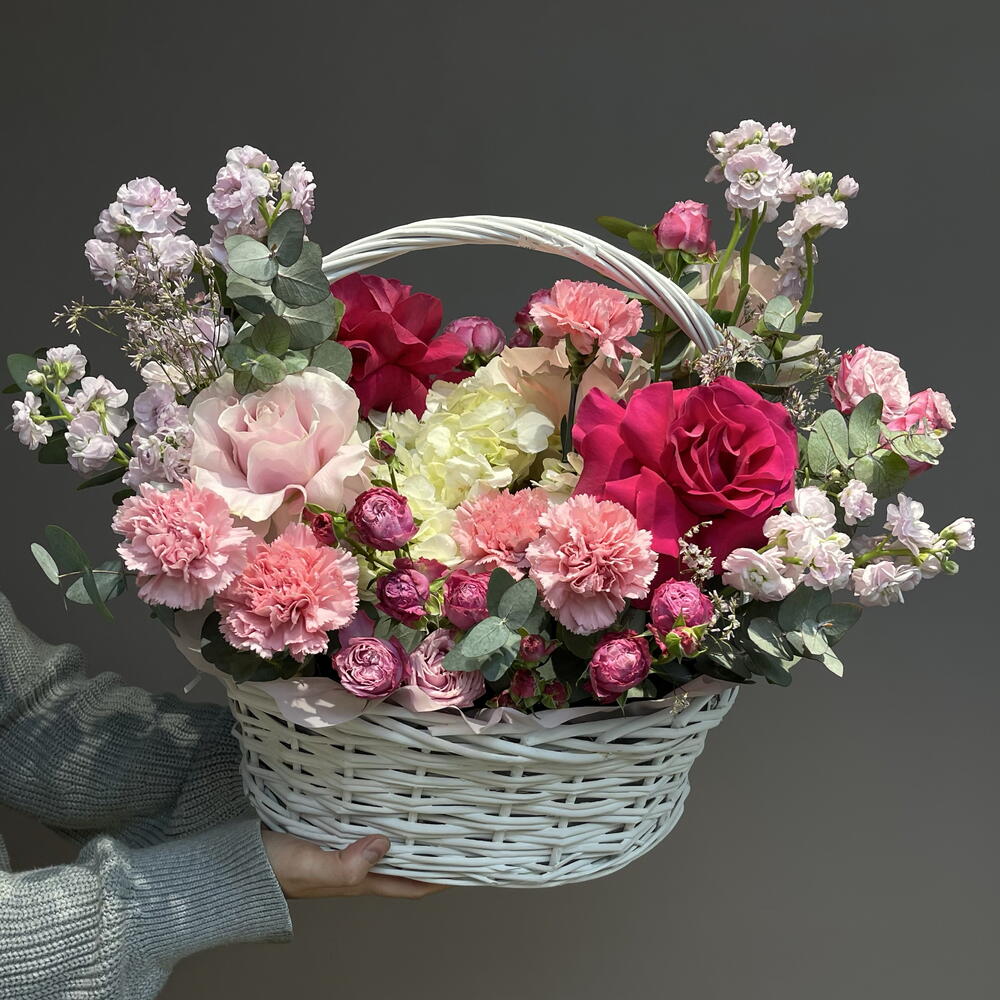 Гортензия - 2 шт. Маттиола - 5 шт. Эвкалипт - 2 шт. Кустовая роза - 3 шт. Диантус - 9 шт. Оазис - 2 шт. Корзина большая - 1 шт. Французская роза - 7 шт.