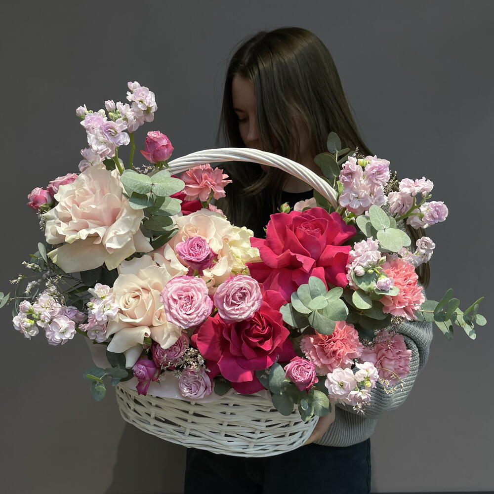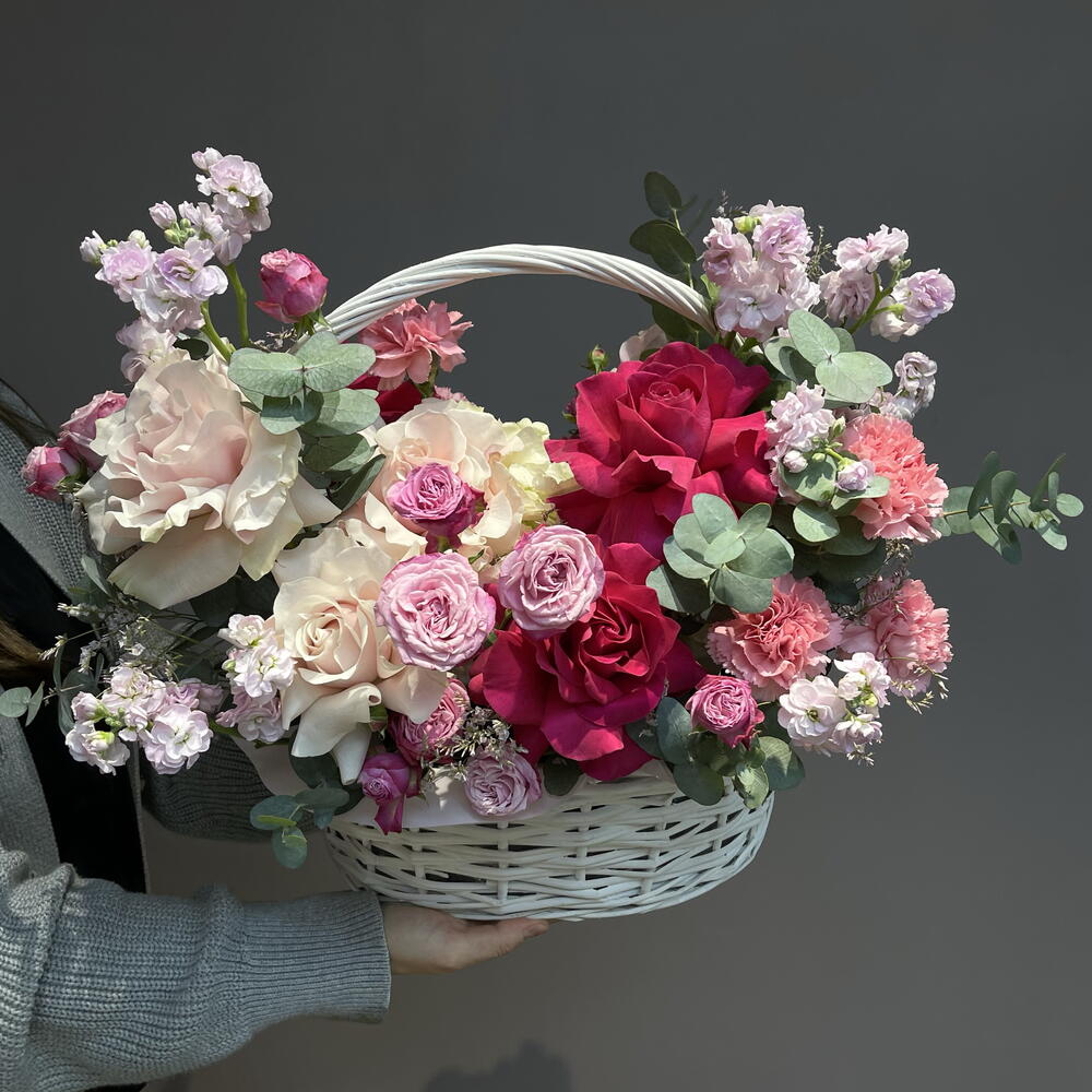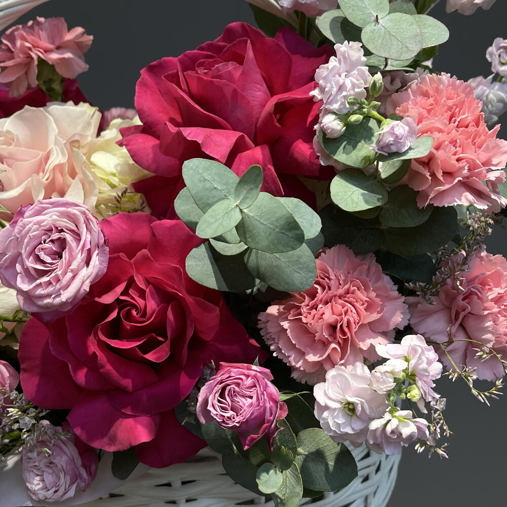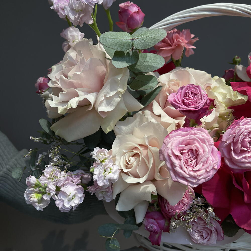 Корзина с французскими розами, маттиолой и эвкалиптом