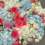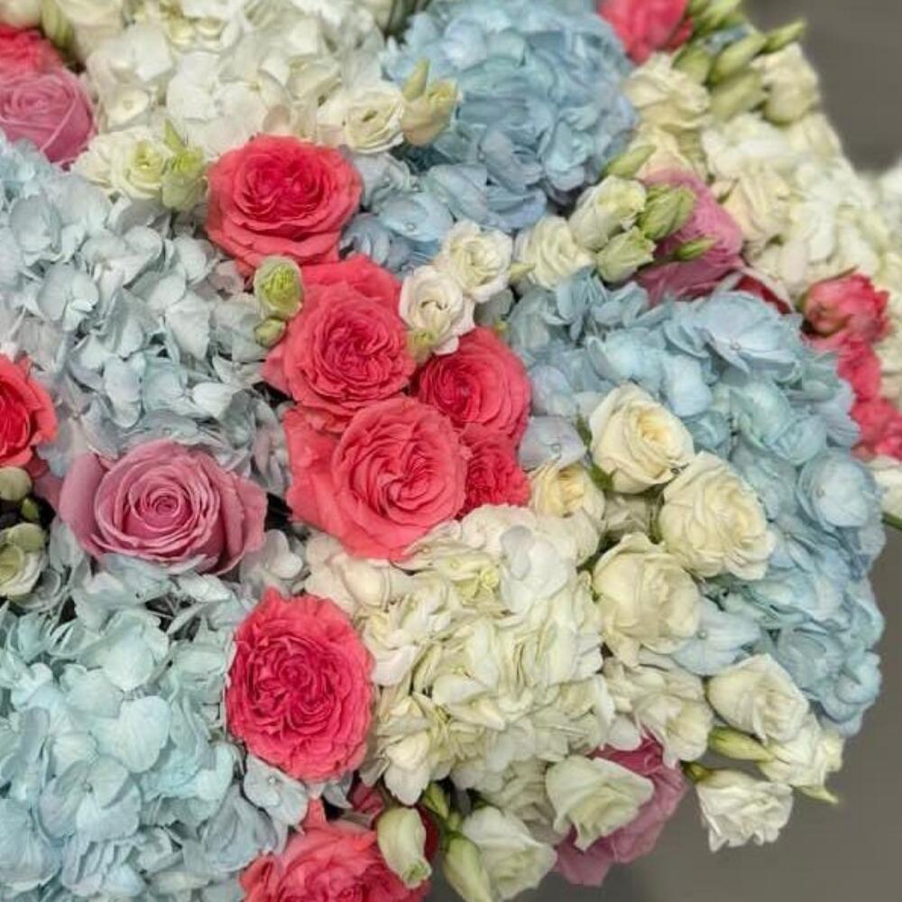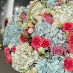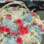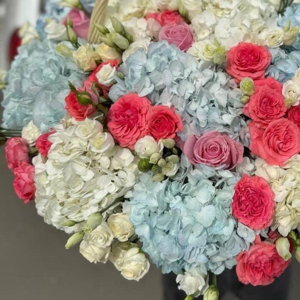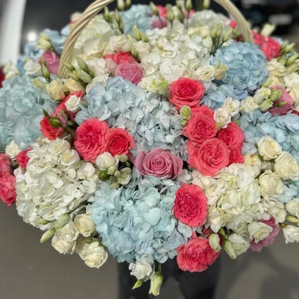 Корзина с гортензиями, розами разных сортов и эустомой