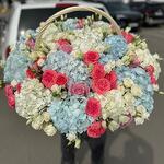 Лента атласная - 1 шт. Корзина плетеная - 1 шт. Открыточка с вашими пожеланиями - 1 шт. Гортензия микс - 17 шт. Губка флористическая - 1 шт. хорошее настроение - 1000 шт. эустома пачка - 2 шт. роза одноголовая пачка - 1 шт. розы кустовые микс пачка - 2 шт.