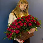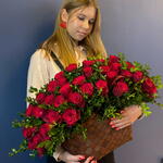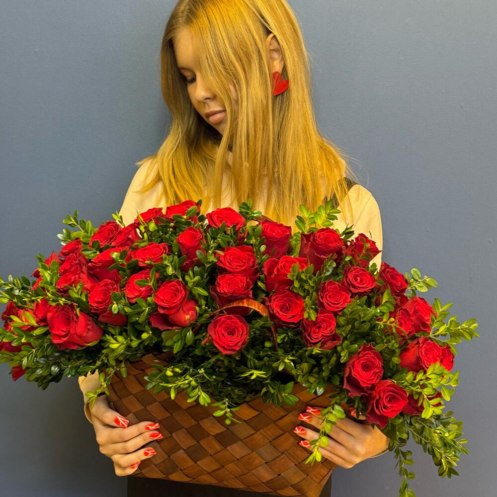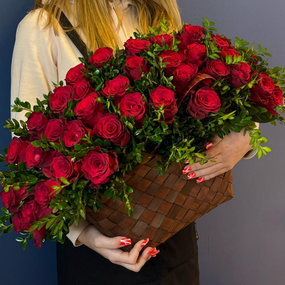 Роскошная плетёная корзина, наполненная благородными красными розами — это классика, которая никогда не выходит из моды. Композиция выглядит объёмной, глубокой и по-настоящему торжественной. Бархатные лепестки насыщенного рубинового оттенка символизируют любовь, страсть и уважение. Бутоны плотные, крупные, раскрытые в идеальной стадии — каждая роза выглядит выразительно и дорого. Аккуратная декоративная зелень с мелкими глянцевыми листочками. Придаёт композиции пышность, подчёркивает глубину красного цвета и создаёт благородную текстуру. Благодаря самшиту корзина выглядит ещё более объёмной и естественной. Дополнительно отправляем брендовый шоколад, памятка по уходу букета,удобрение кризал для продление жизни букета Доставка/самовывоз 24/7