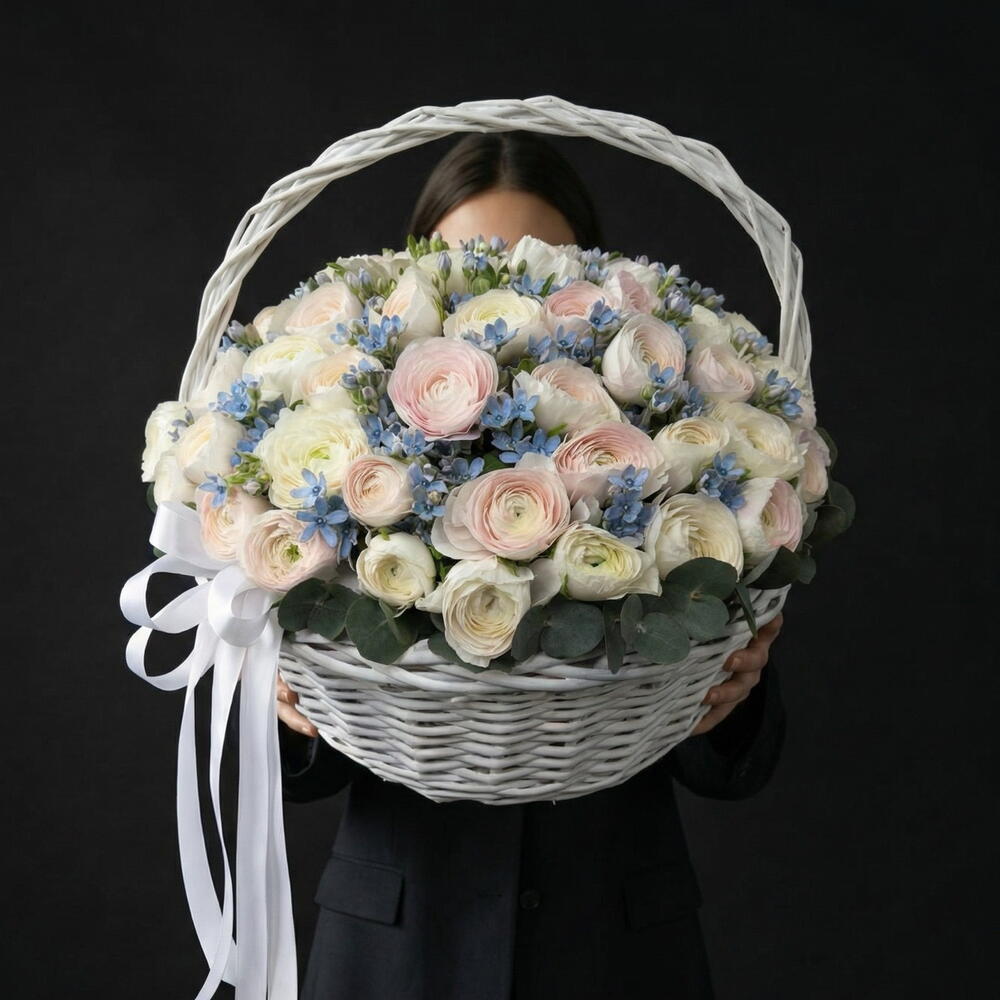 Корзина плетеная - 1 шт. Ранункулюс клуни ханой - 51 шт. Губка флористическая - 3 шт. оксипеталум голубой - 50 шт.