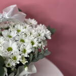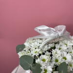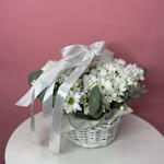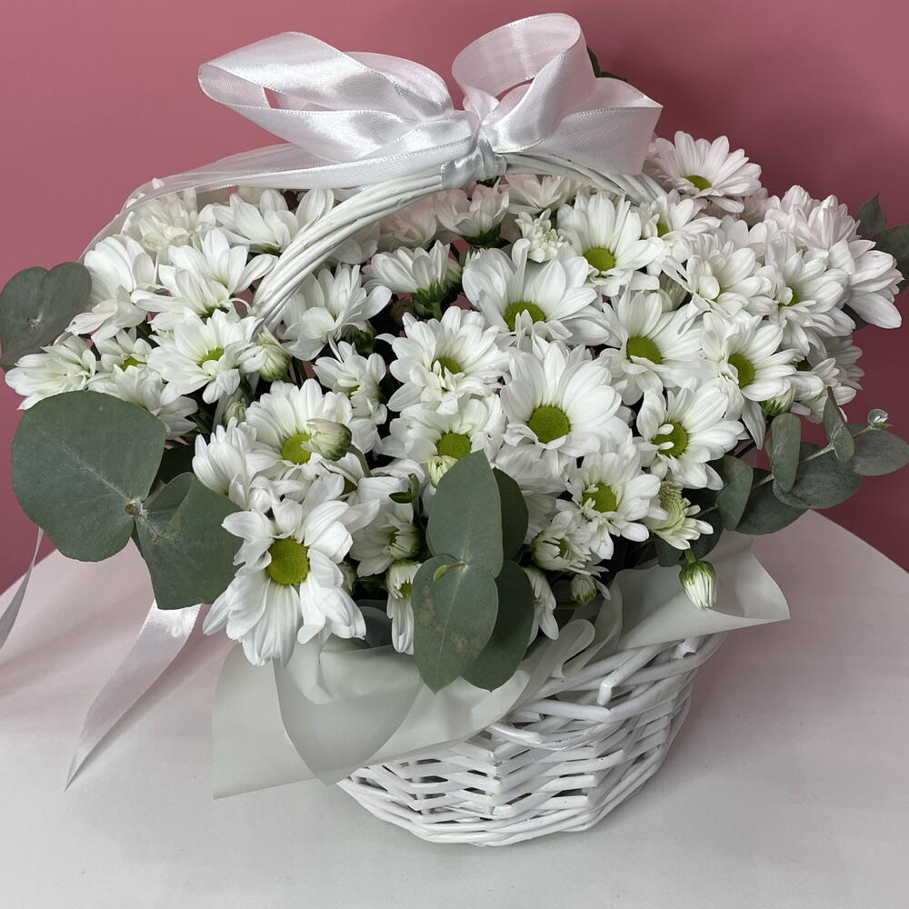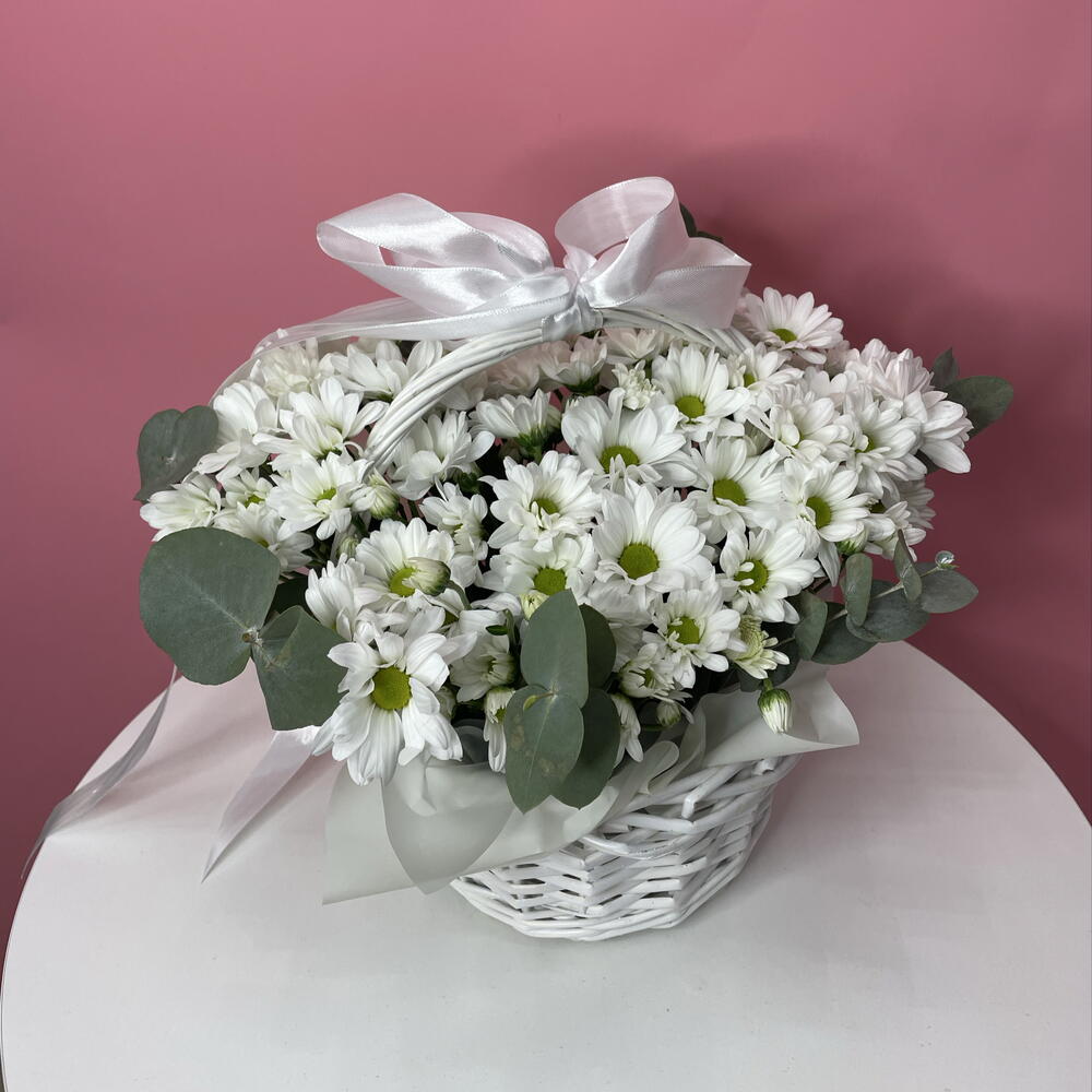 Эвкалипт - 2 шт. Лента атласная - 1 шт. Оазис - 3 шт. Корзина плетеная - 1 шт. кустовая хризантема ромашка - 5 шт.