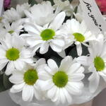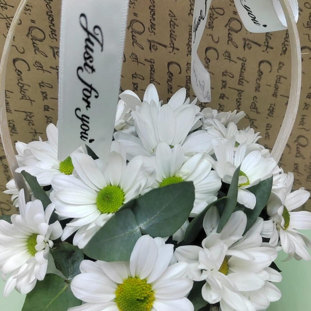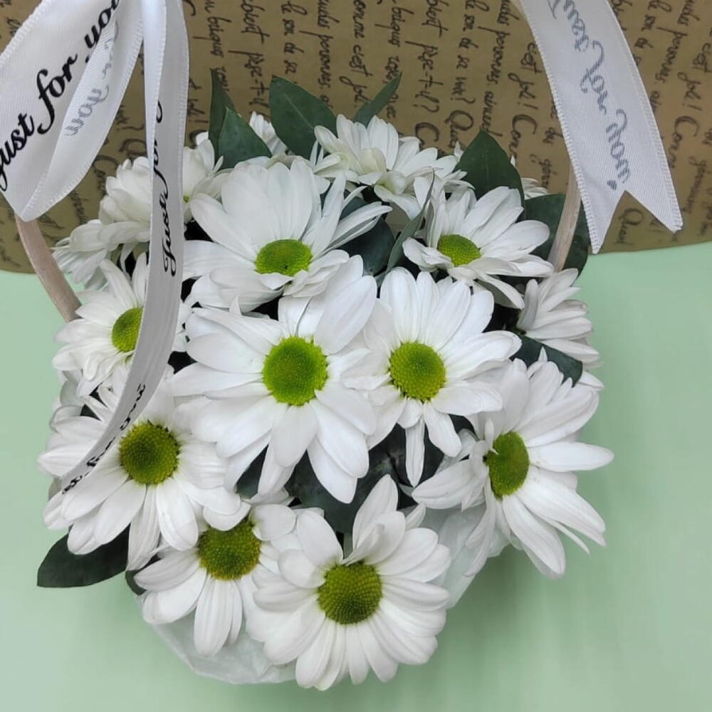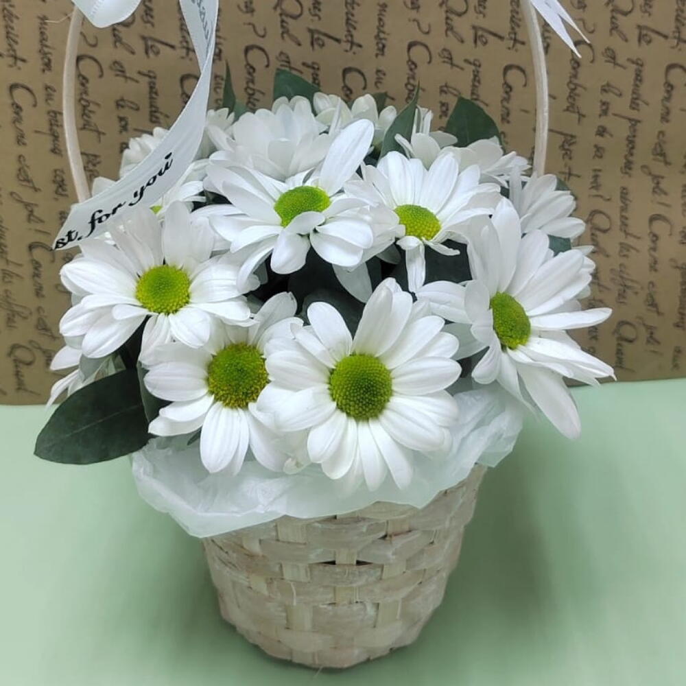 Белая ромашковая кустовая хризантема сорта Баккарди и зелень салала в плетеной корзинке. Диаметр корзинки 15 см, высота бортика 10 см и высота ручки 29 см. Внутри корзинки губка с питательным составом, в которую погружены стебли цветов. Достаточно раз в два-три дня добавлять в губку немного воды, наливая прямо сверху, между цветочными бутонами, и нежные ромашки будут радовать получателя не менее 7-10 дней.