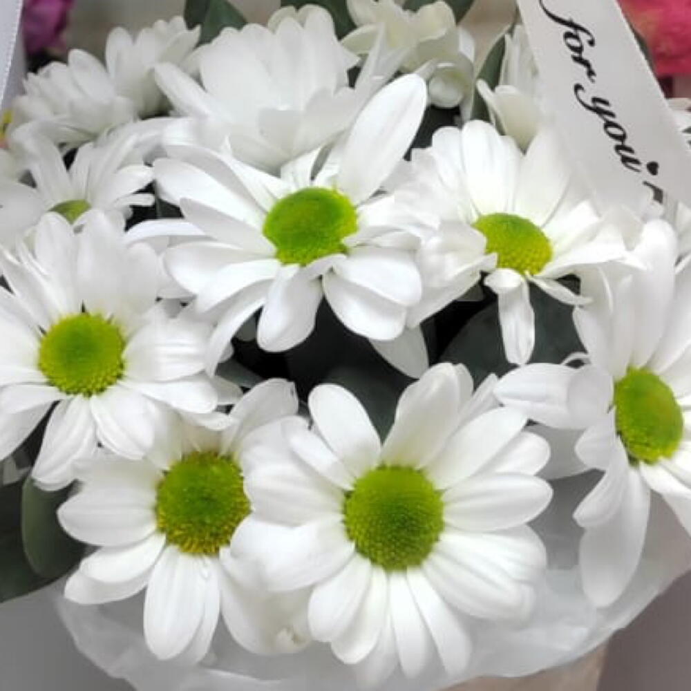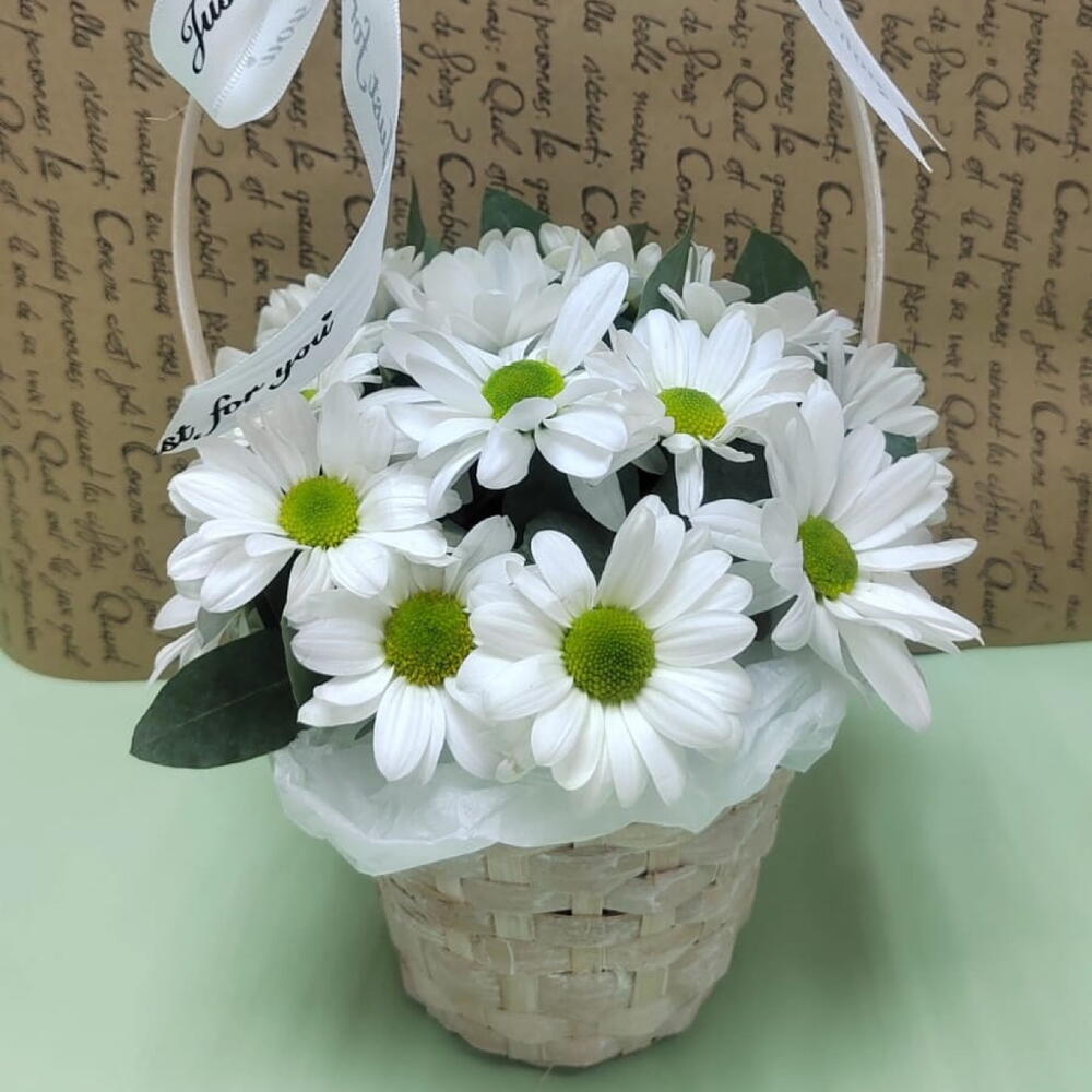 Корзина мини с ромашковыми хризантемами и салалом