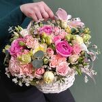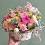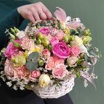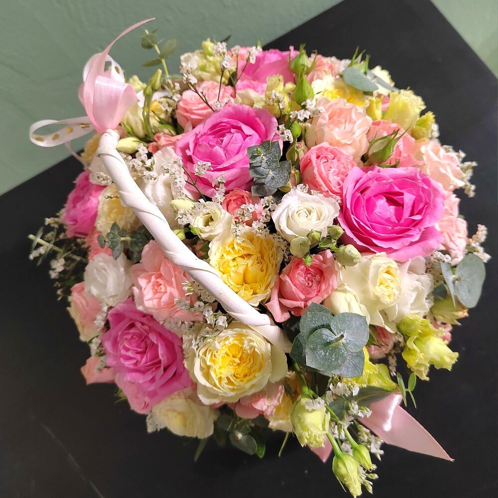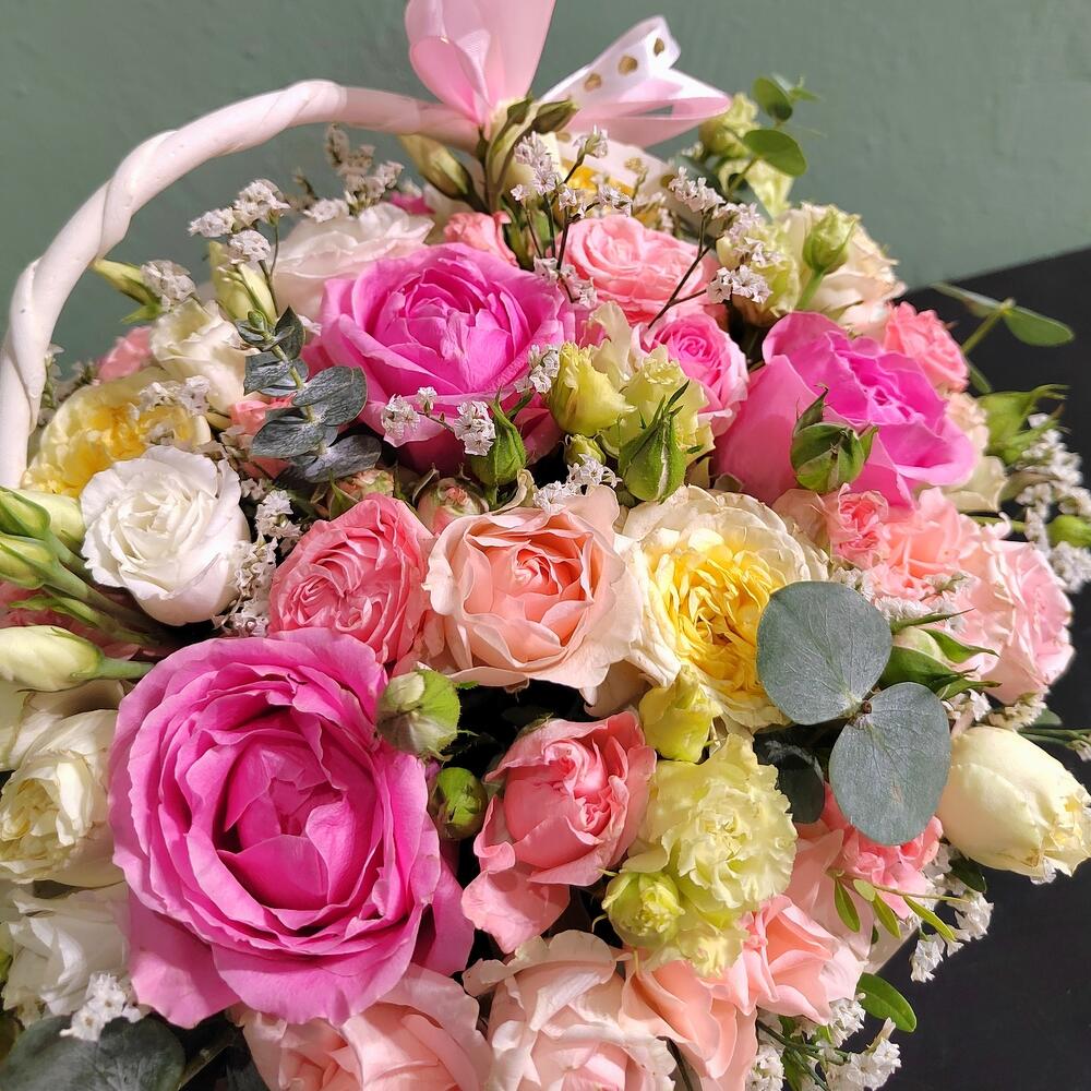 Лизиантус - 2 шт. Лимониум - 2 шт. Эвкалипт - 3 шт. Роза розовая - 5 шт. розы кустовые микс - 6 шт. корзина с атласными лентами и оазис - 1 шт.