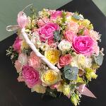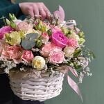 Розы в корзине, Корзинка с розами "Жардин". Розы, кустовые розы в нежной композиции средний размер .n90
