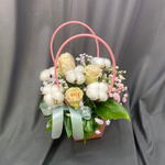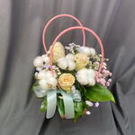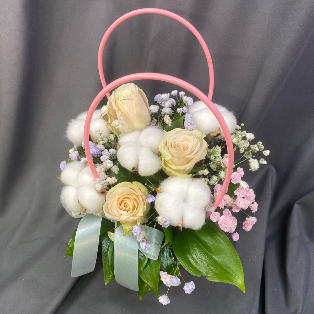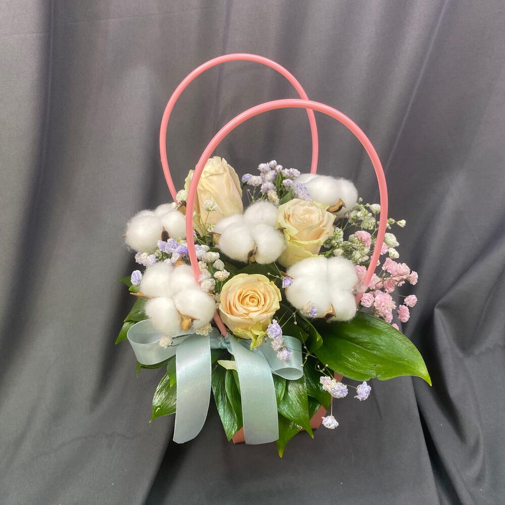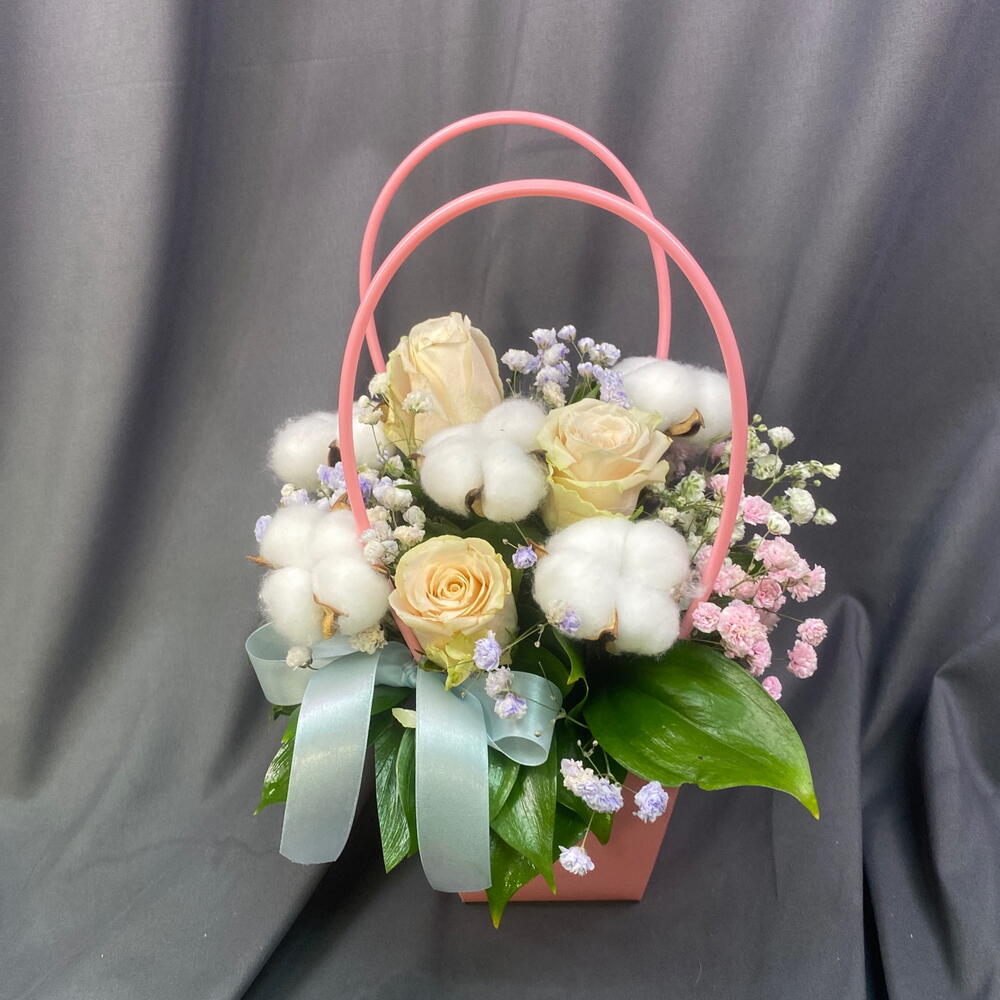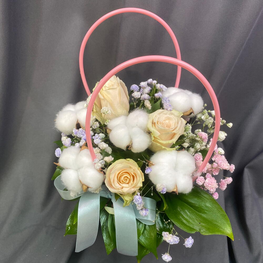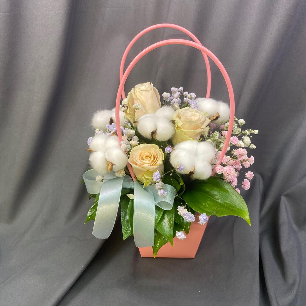 Гипсофила - 3 шт. Рускус - 5 шт. Сумочка - 1 шт. Хлопок натуральный - 5 шт. Роза шармант - 3 шт.