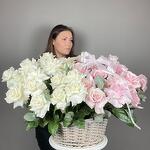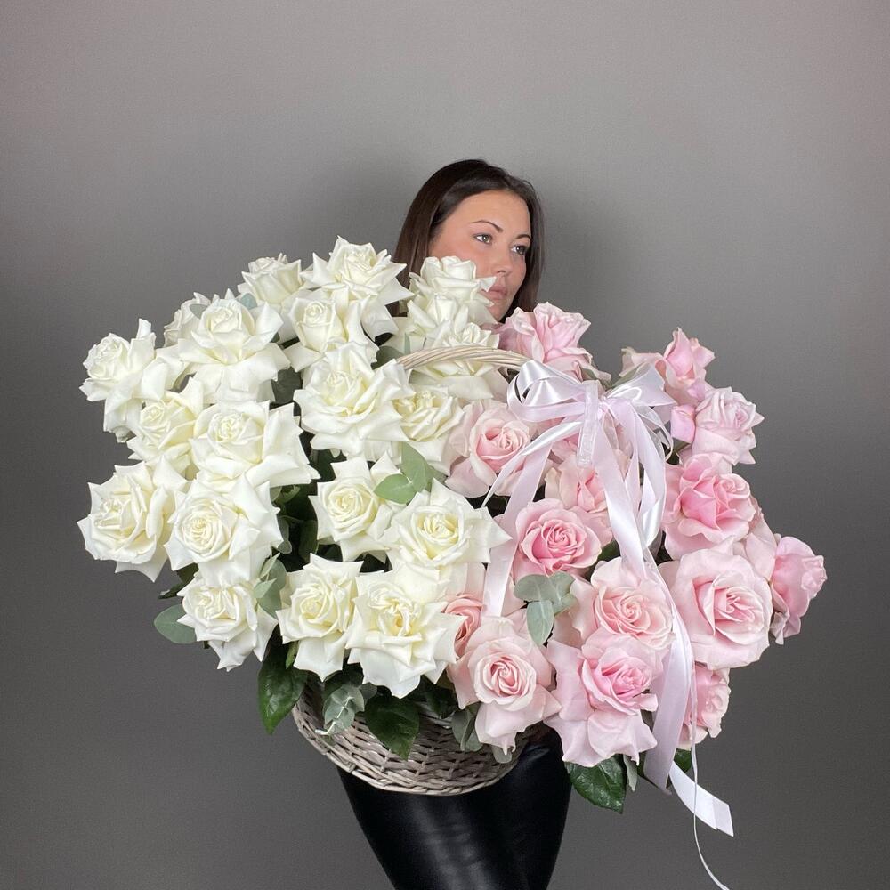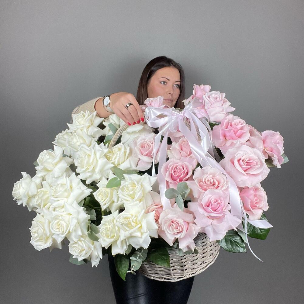Лента атласная - 5 шт. Роза эквадор розовая - 21 шт. Корзина плетеная - 1 шт. Роза Эквадор белая - 20 шт.
