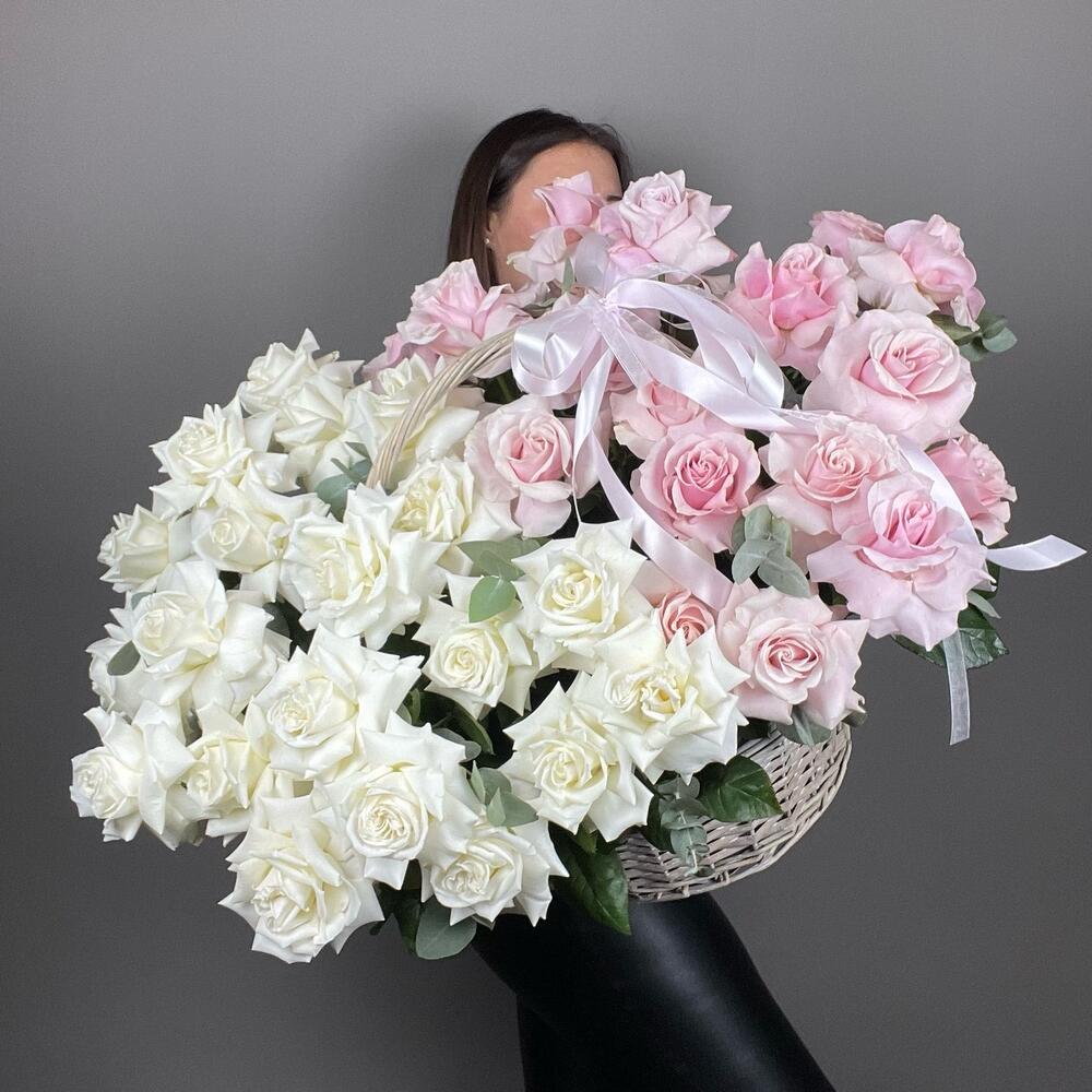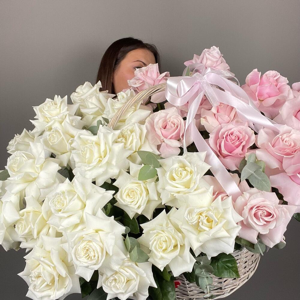 Огромная корзина с кружевными ароматными розами из солнечного Эквадора станет отличным напоминанием о Ваших чувствах и точно запомнится надолго🥰