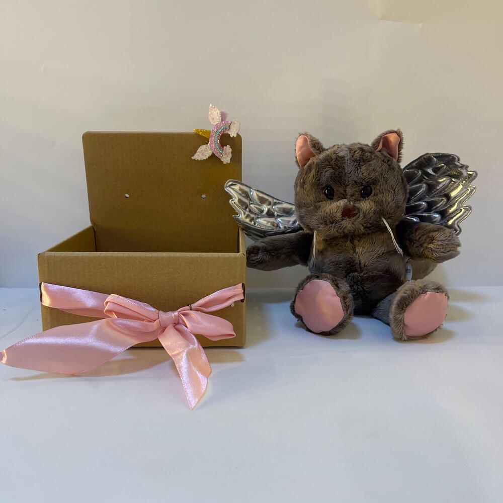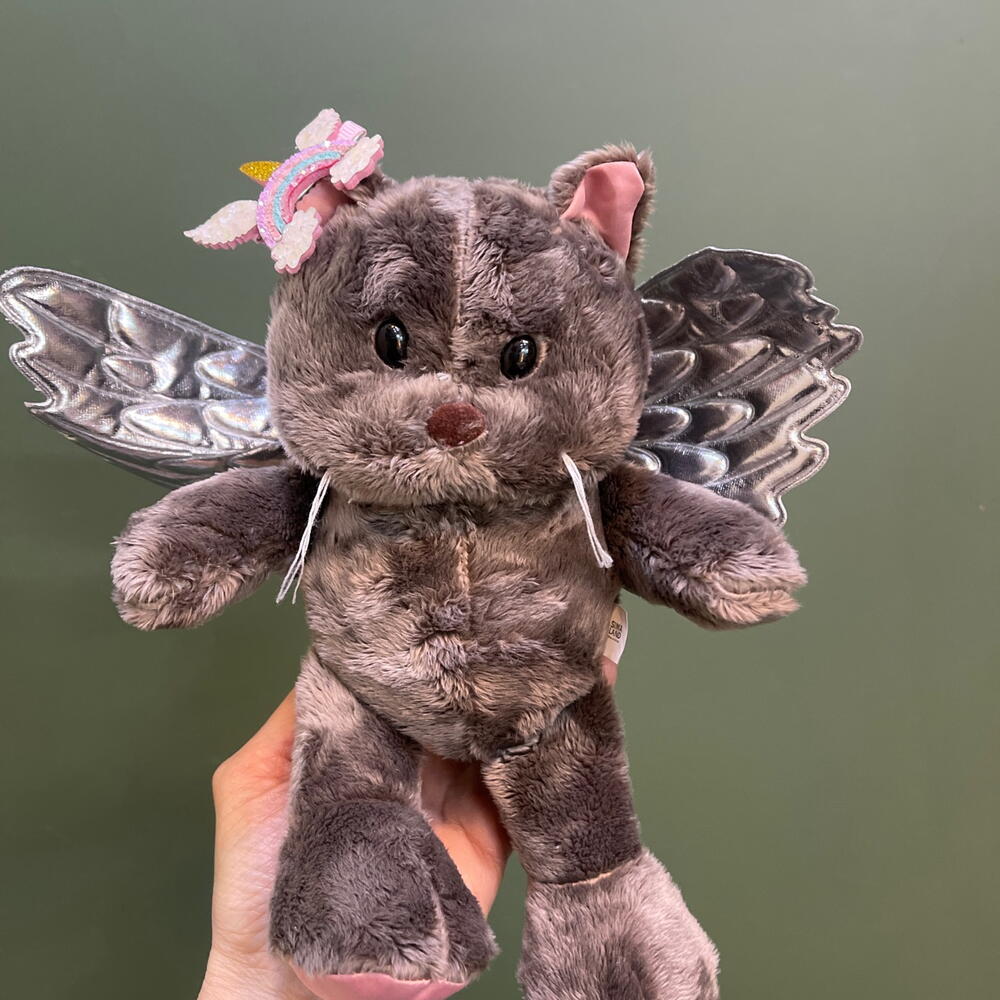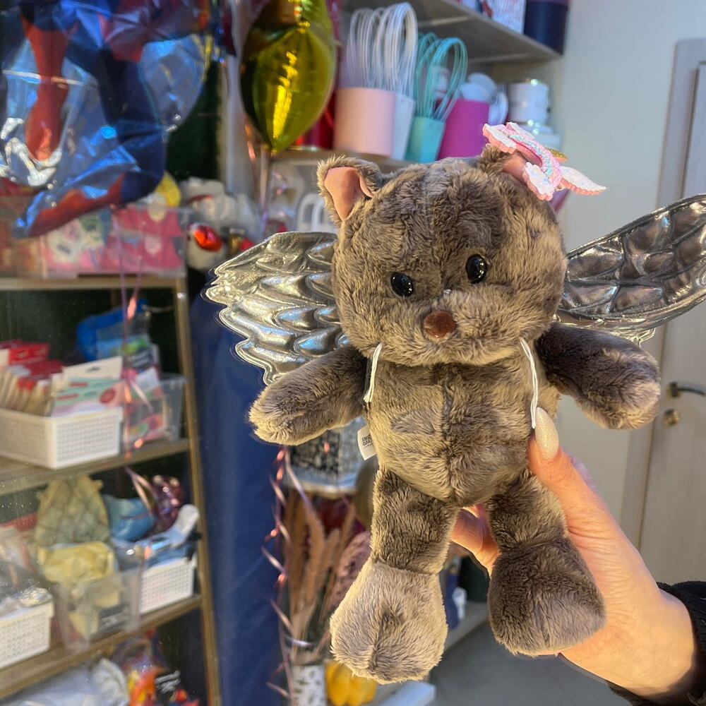 «Это не просто игрушка, а настоящий маленький ангел! Очаровательная кошечка Марта с серебристыми крылышками и нежным розовым бантом принесёт в дом уют и капельку волшебства. Её мягкая плюшевая шубка так и просит объятий».