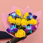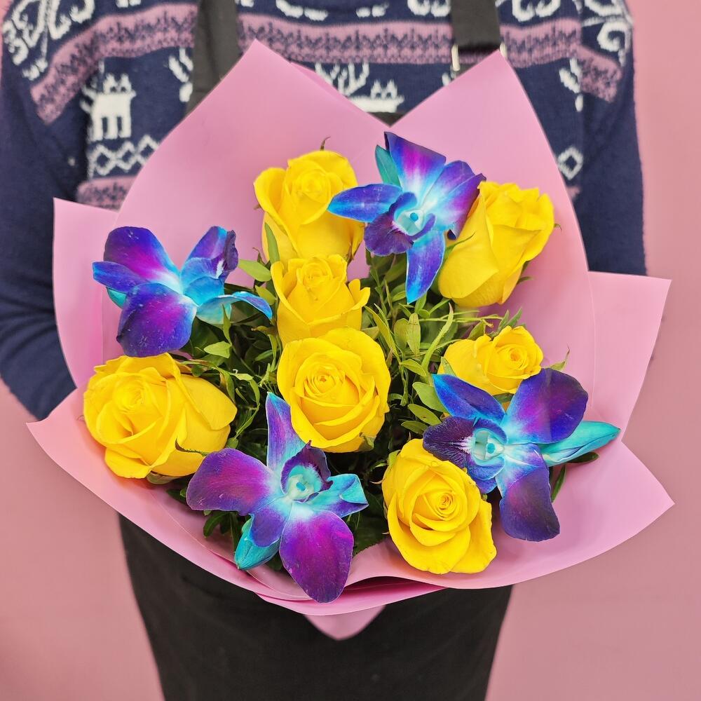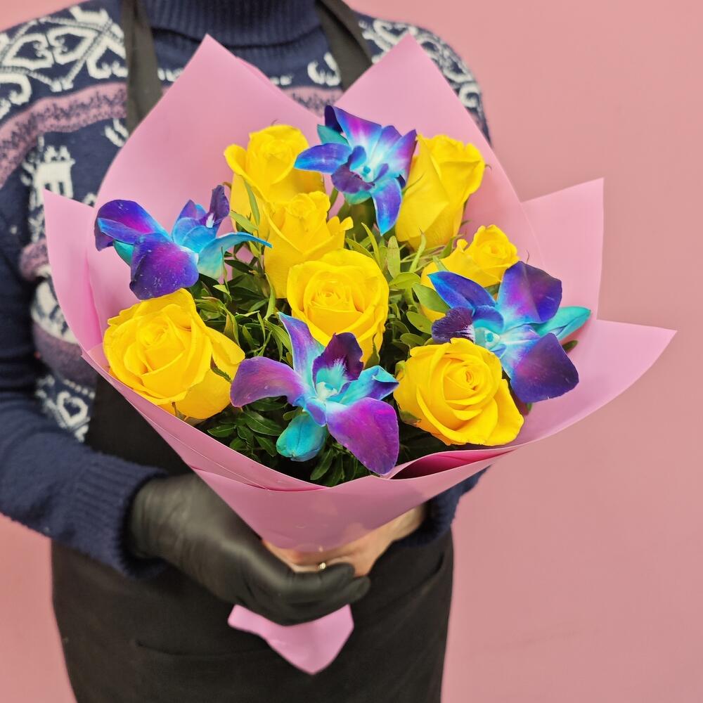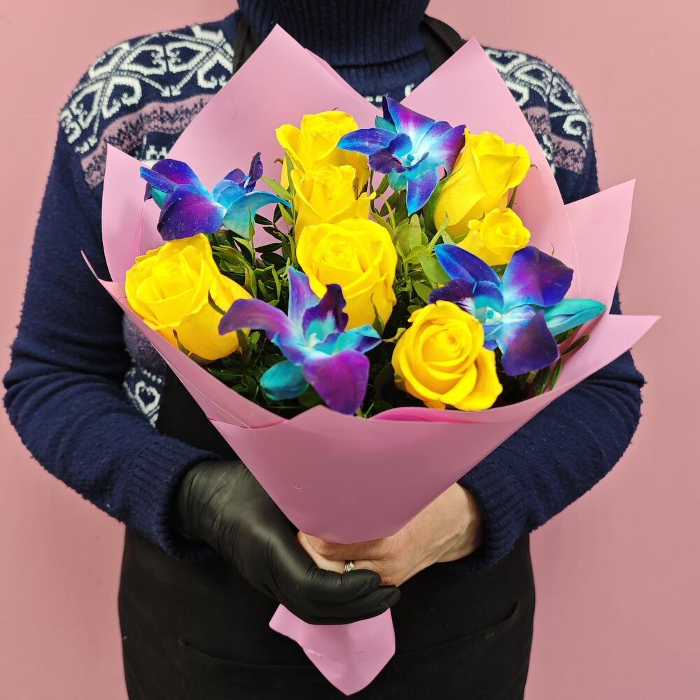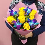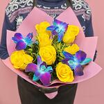 Роза - 7 шт. Лента атласная - 1 шт. Упаковка дизайнерская - 2 шт. Орхидея дендробиум синяя - 4 шт. фисташка ветка - 3 шт.