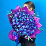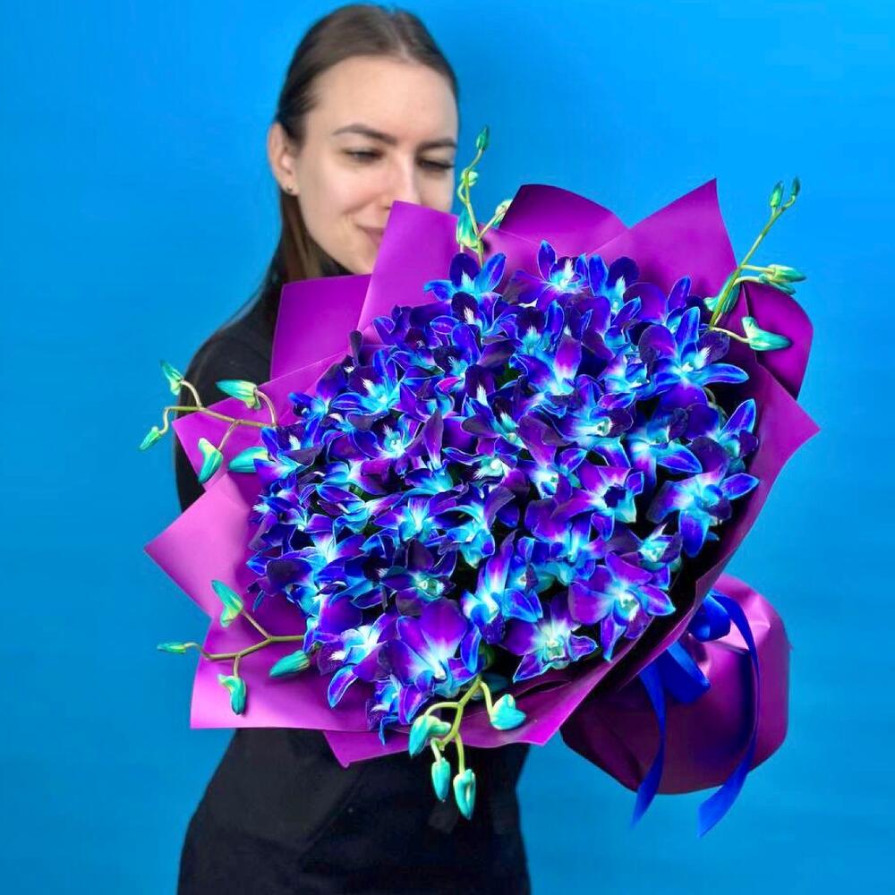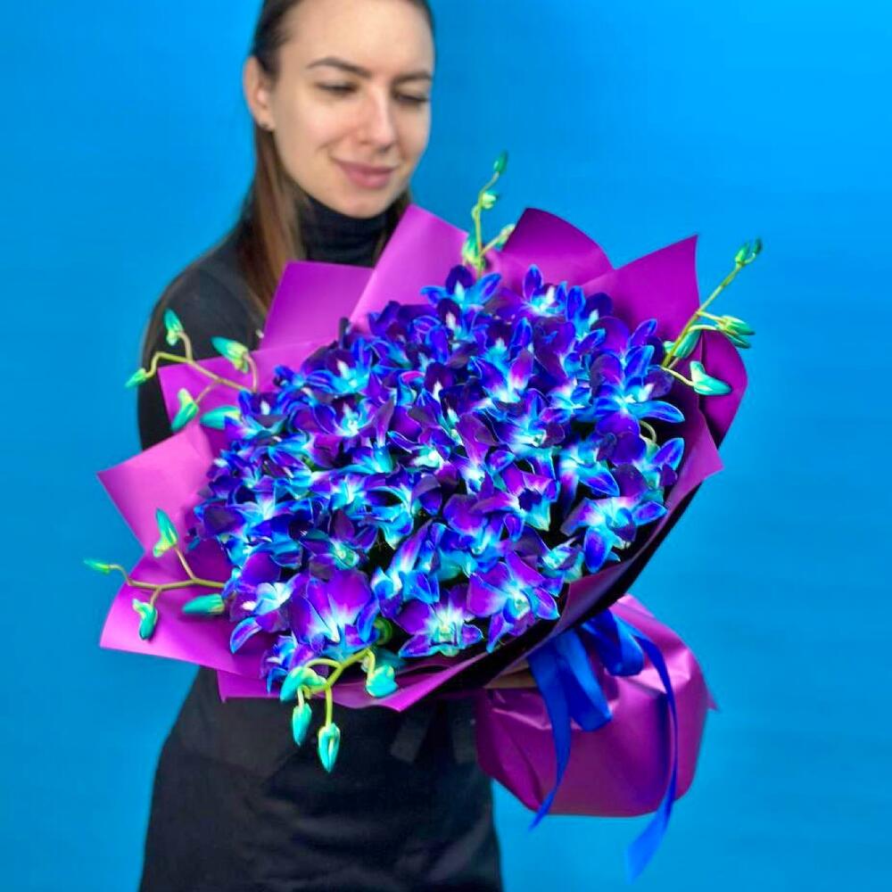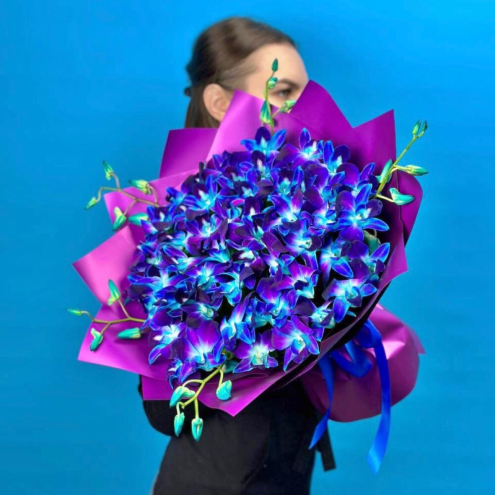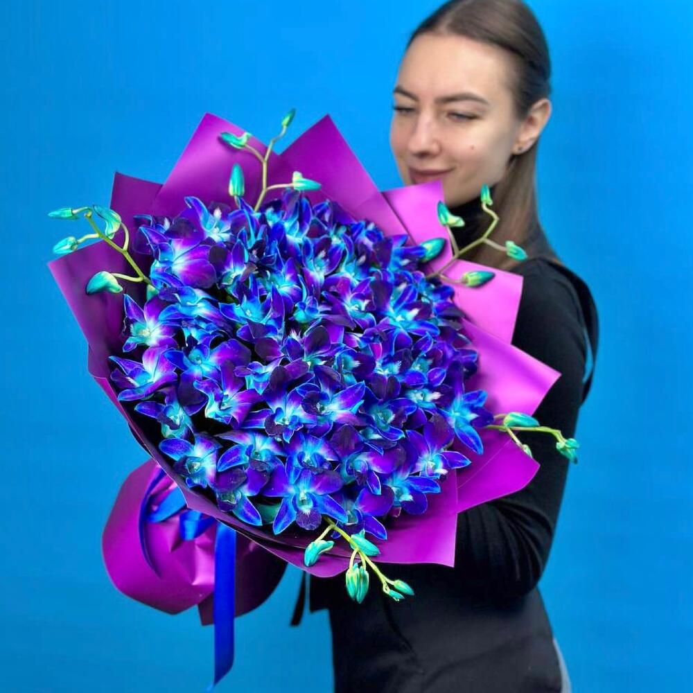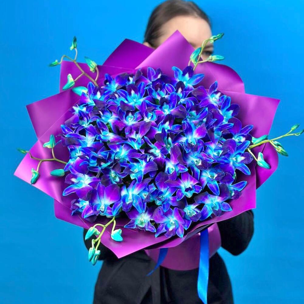 Орхидея Дендробиум - 45 шт. Лента атласная - 1 шт. Пленка матовая - 4 шт. инструкция по уходу за цветами - 1 шт. минералы для срезанных цветов - 1 шт. персональная открытка с вашими пожеланиями - 1 шт.