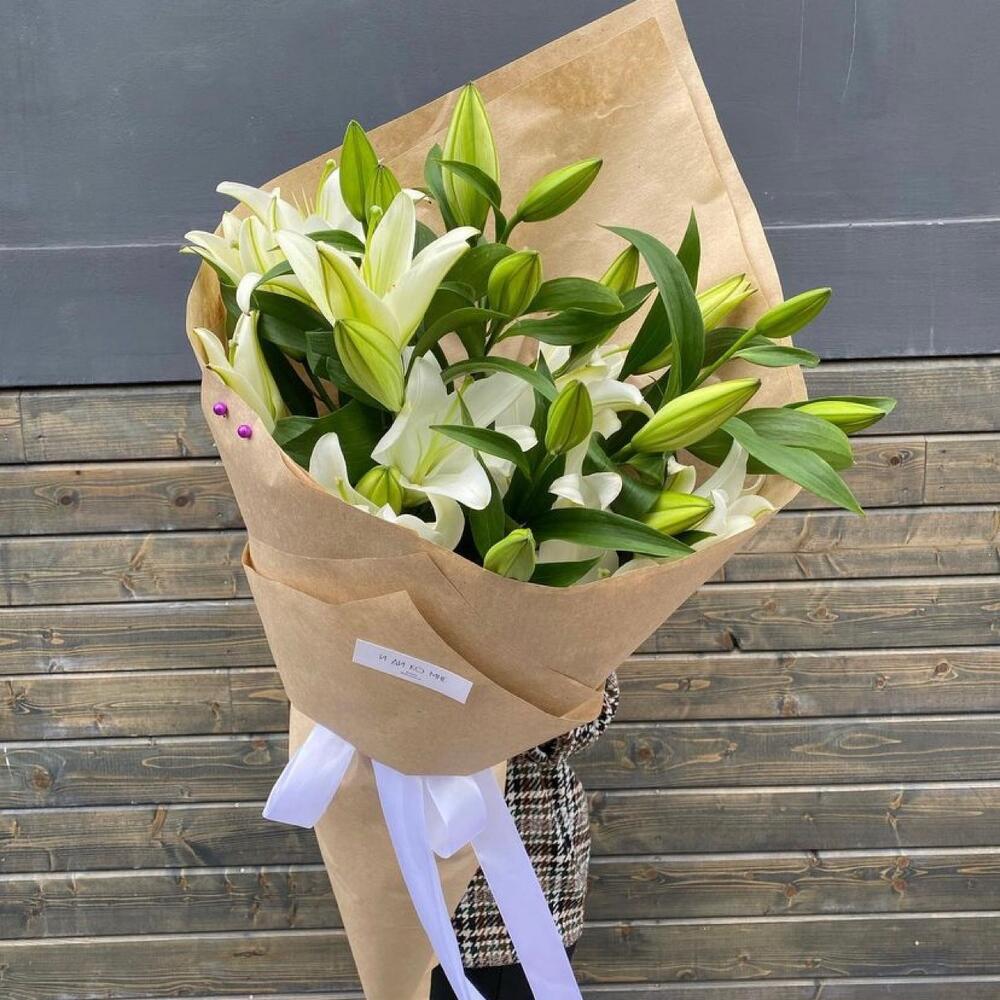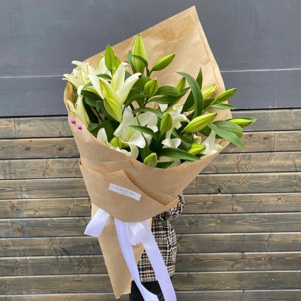 Лента - 1 шт. Лилия - 5 шт. Бусина - 1 шт. Упаковка крафт - 2 шт. аквапак с водой - 1 шт. памятка по уходу и подкормка для цветов - 1 шт.