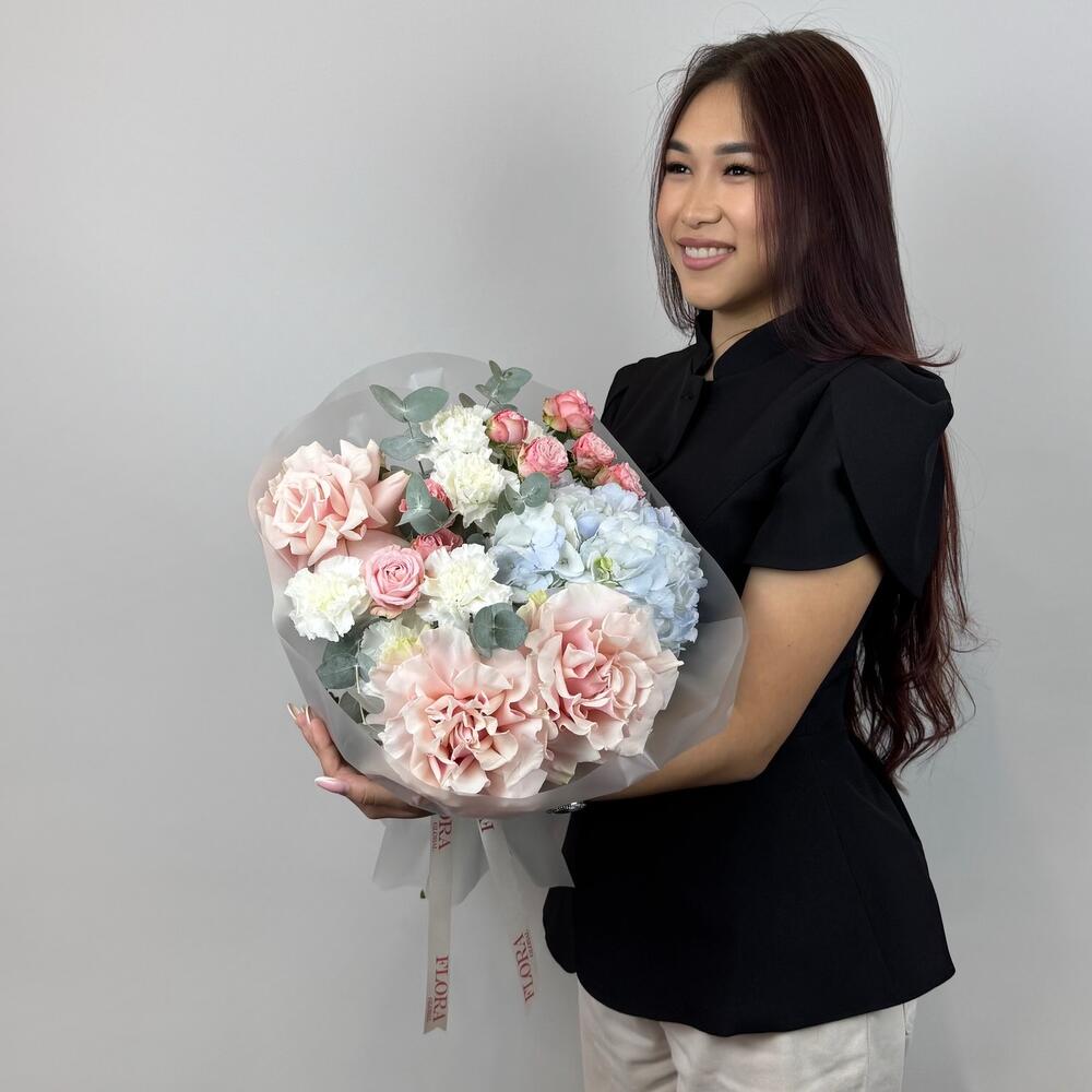 Красивый букет: французская роза, гортензия, кустовая пион.роза, диантусы и эвкалипт. N26