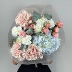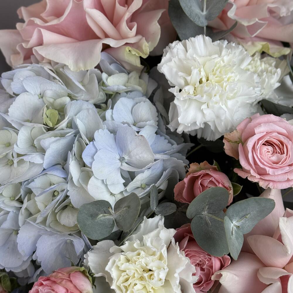 Эвкалипт - 1 шт. Лента атласная - 1 шт. Фисташка - 2 шт. Кустовая пионовидная роза - 2 шт. Упаковка дизайнерская - 1 шт. Гортензия голубая - 1 шт. диантус белый (гвоздика) - 6 шт. розовая французская роза - 3 шт.
