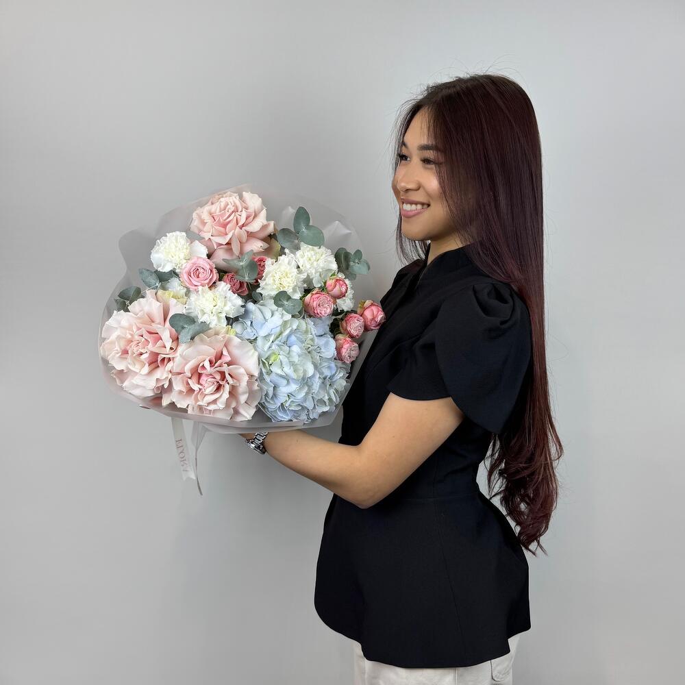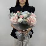 Нажмите ♥️, чтобы сохранить понравившийся товар в подборку и не потерять. 🚚 Бережно упакуем Ваш заказ, чтобы букет доехал в целости и сохранности. 💬 Если есть дополнительные пожелания или вопросы, мы всегда рады помочь в чате по заказу. Красивый букет из кустовых пионовидных роз с французскими розами, гортензией, диантусами (гвоздика) и эвкалиптом. В составе: Кустовая пионовидная роза Мадам Бомбастик 2шт, розовая французская роза Пинк Мондиаль 3 шт, диантус (белая гвоздика) 6 шт, гортензия голубая 1 шт и веточки эвкалипта. Розы, кустовая пионовидная Мадам Бомбастик и французская Пинк Мондиаль — самые нежные розы. Диантусы славятся не только своей красотой, но и стойкостью. Пышная гортензия и ароматный эвкалипт – дополняют этот воздушный букет. Нежный букет цветов с кустовой пионовидной розой, розовой французской розой, гортензией, диантусами и эвкалиптом - это тот самый букет, который произведет wow-эффект, подарит получателю множество положительных эмоций и украсит любое пространство. Как продлить жизнь цветам - правила ежедневного ухода: 1. Подрезать стебли острым ножом или секатором. 2. Поставить букет в вазу, подходящего размера, с прохладной водой. 3. Регулярно менять воду в вазе, подрезая стебли под углом. 4. Цветы необходимо держать в прохладном месте, защищенном от солнечных лучей и отопительных приборов. 5. Не ставьте букет рядом с фруктами и овощами. 6. В цветочную композицию с флористической губкой необходимо подливать воду в центр композиции по мере высыхания флористической губки. ⭐️ У нас можно дополнить подарок! Выберите к букету: воздушные шары, коробку конфет, свечи, топпер, открытку.