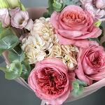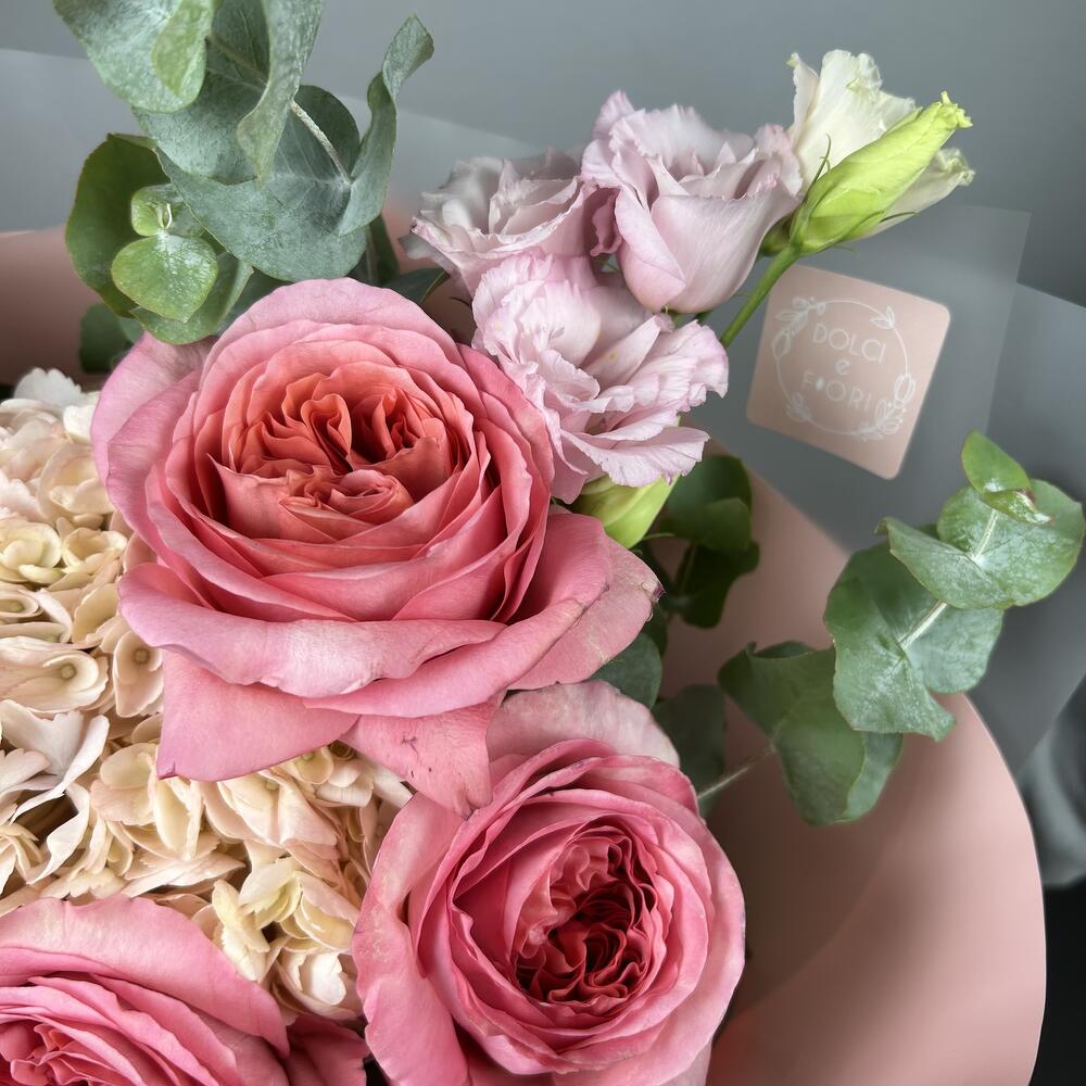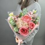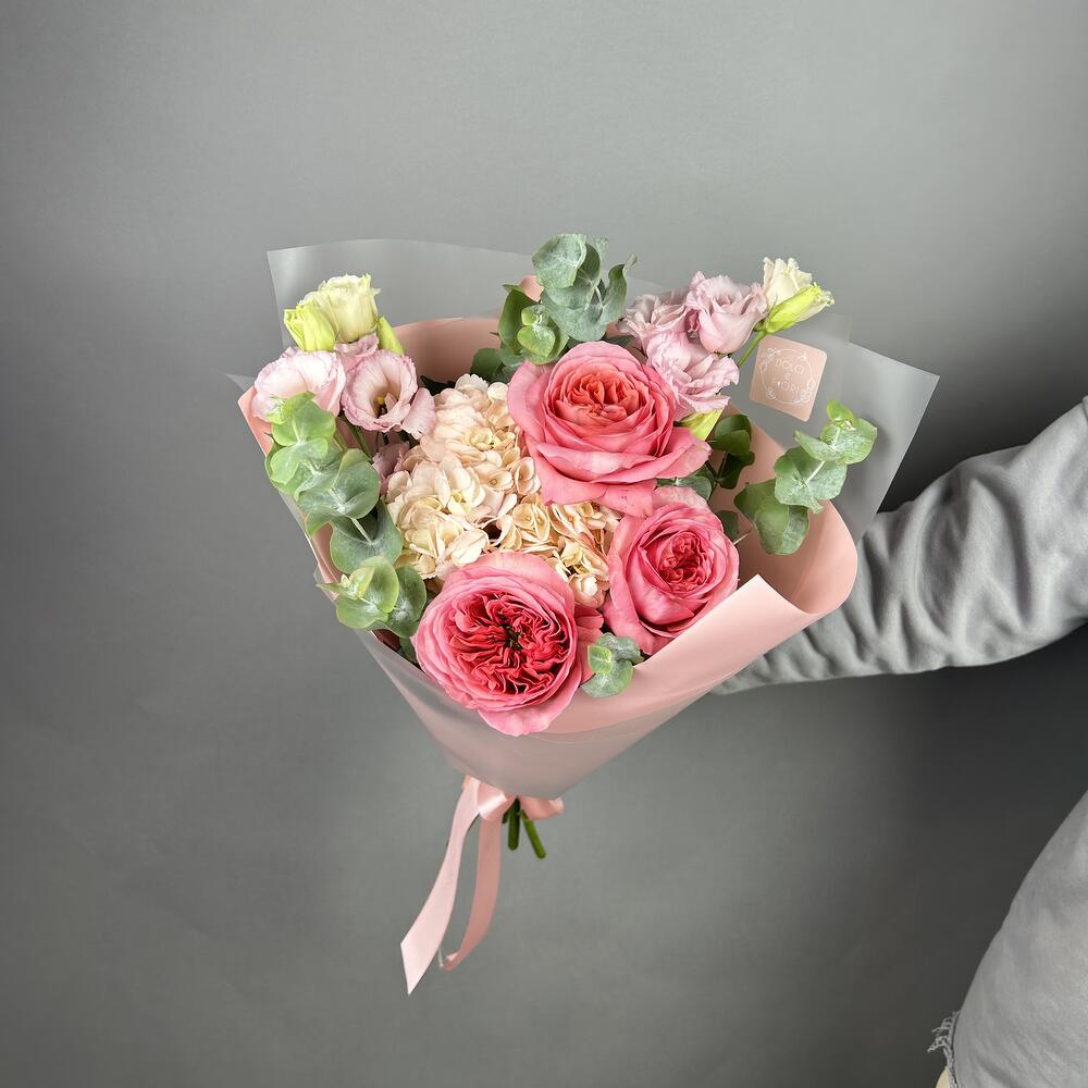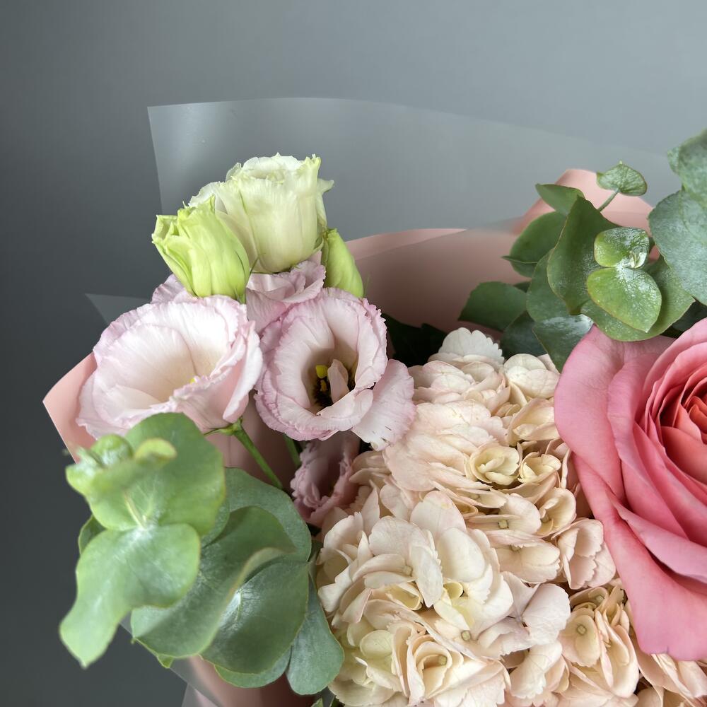 Гортензия - 1 шт. Лизиантус - 2 шт. Эвкалипт - 1 шт. Упаковка - 1 шт. Лента атласная - 1 шт. роза пинк экспрешн - 3 шт.