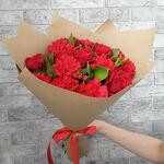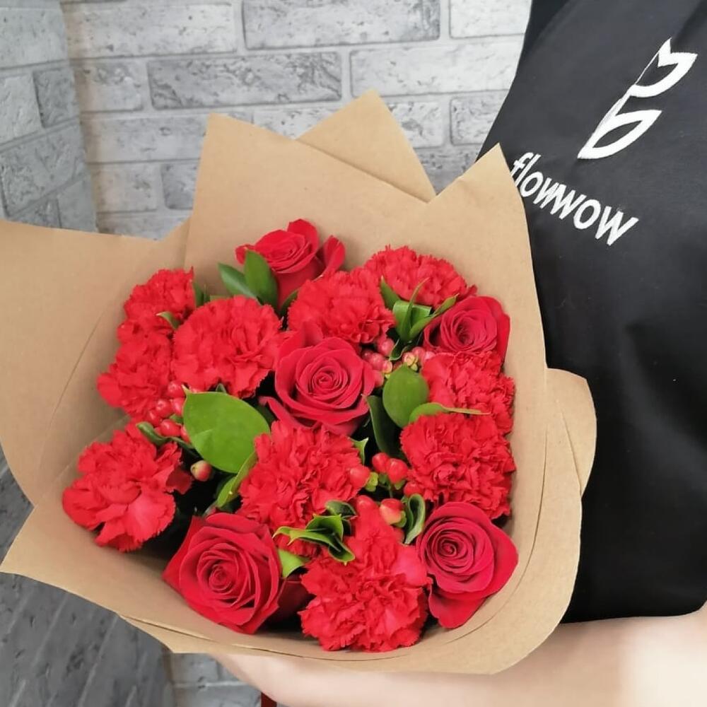 Гиперикум - 3 шт. Рускус - 6 шт. Лента атласная - 1 шт. Крафт - 3 шт. Роза колумбия - 5 шт. Диантус красный - 10 шт.