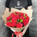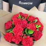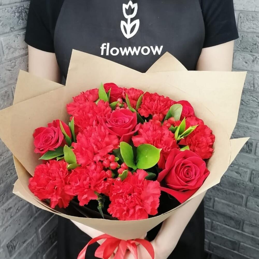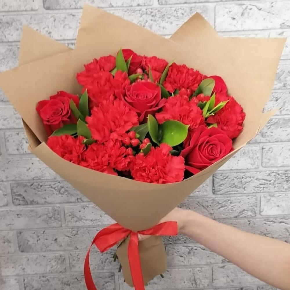 Невероятно красивое сочетание красных гвоздик и алых роз, подойдет к любому случаю и мероприятию