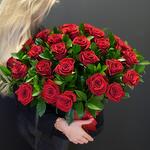 Лента атласная - 1 шт. Коробка шляпная - 1 шт. Открыточка с вашими пожеланиями - 1 шт. розы красные - 25 шт. хорошее настроение от наших флористов - 10000 шт.