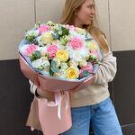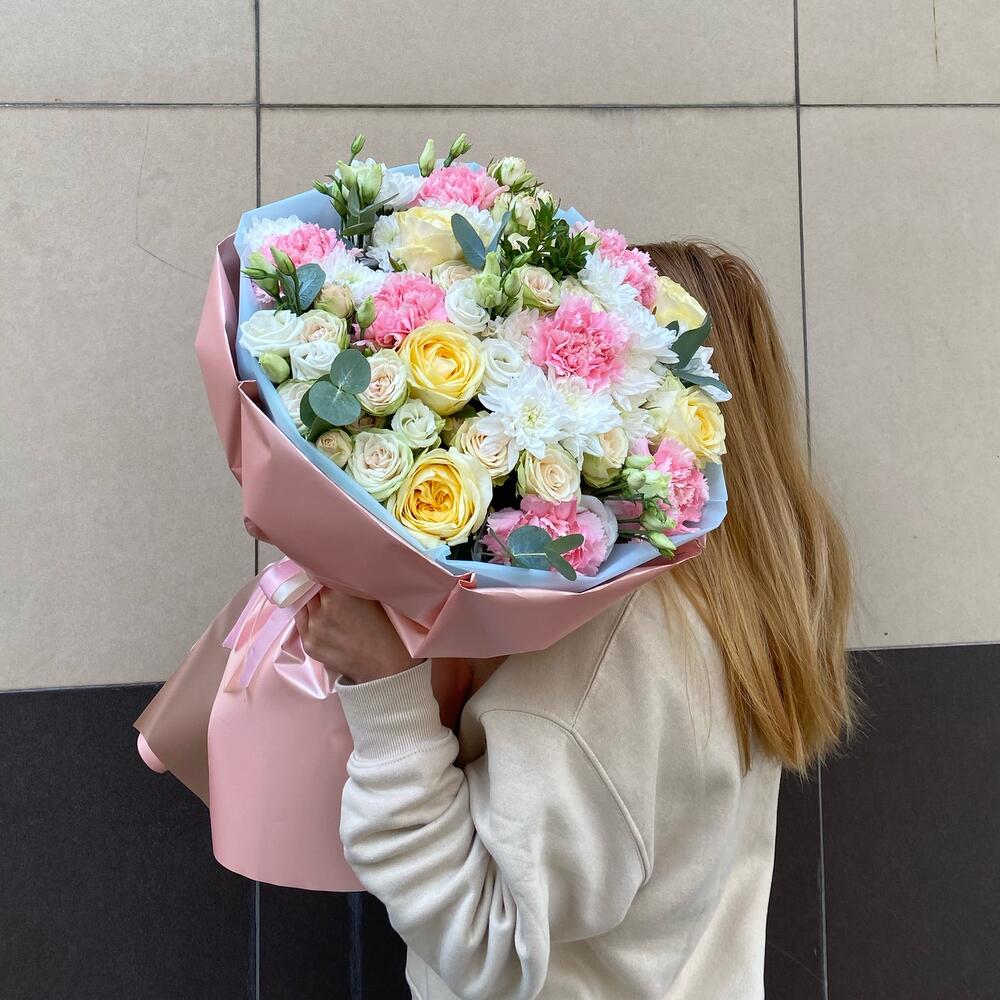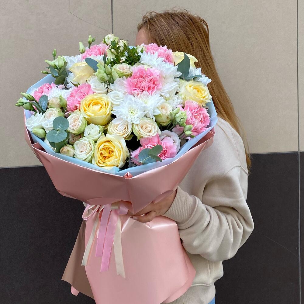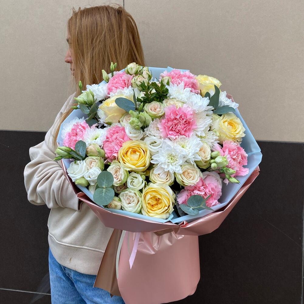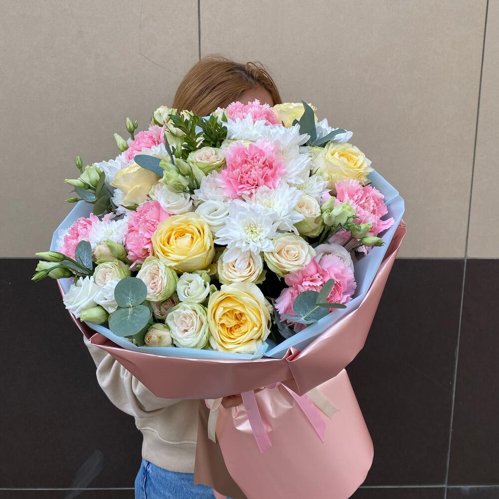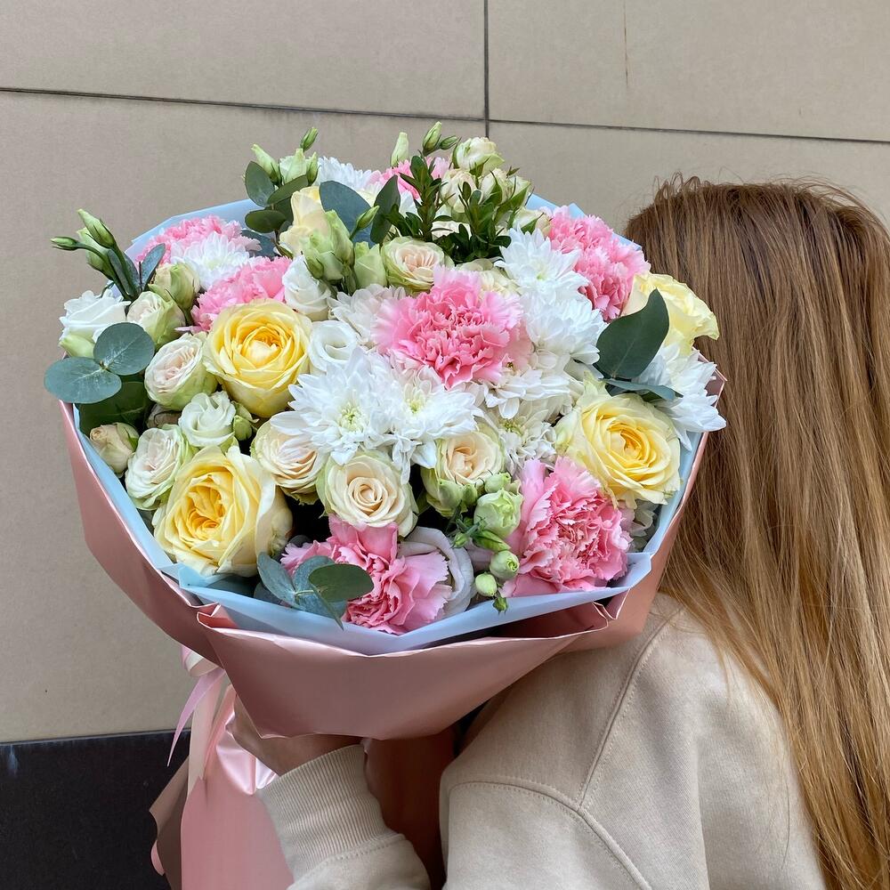 Писташ - 1 шт. Хризантема кустовая - 3 шт. Эвкалипт - 1 шт. Роза - 5 шт. Кустовая роза - 4 шт. Диантус - 7 шт. Упаковка дизайнерская - 1 шт. эустома белая - 3 шт.