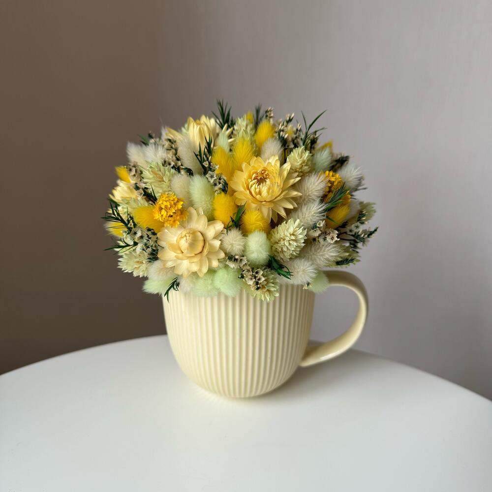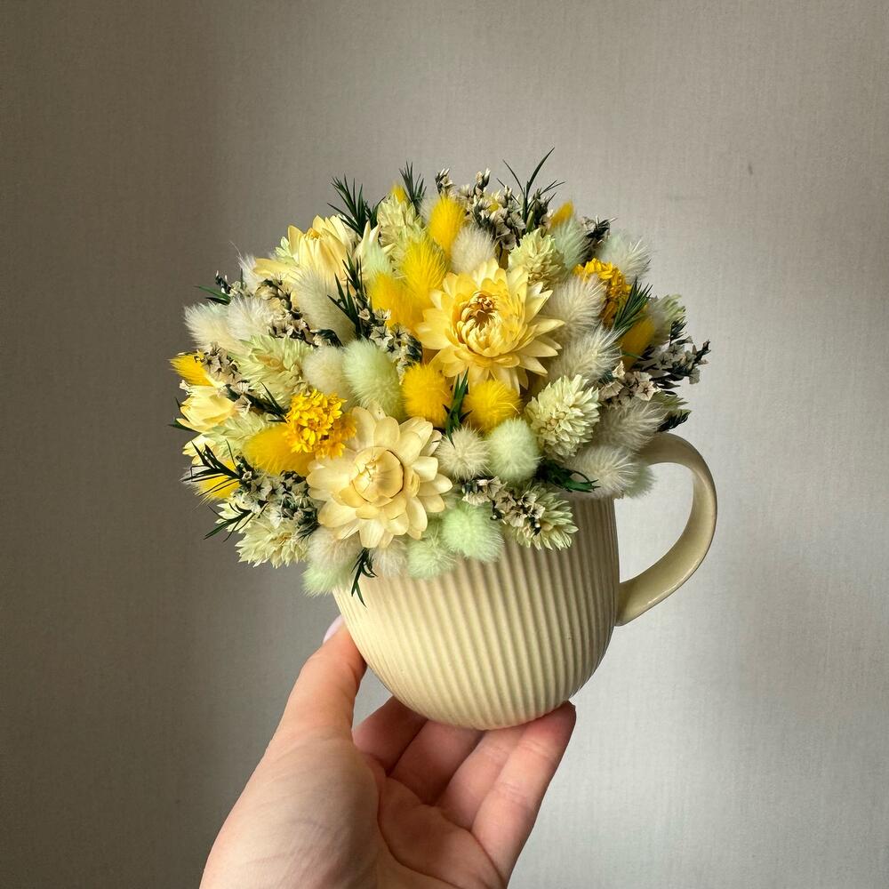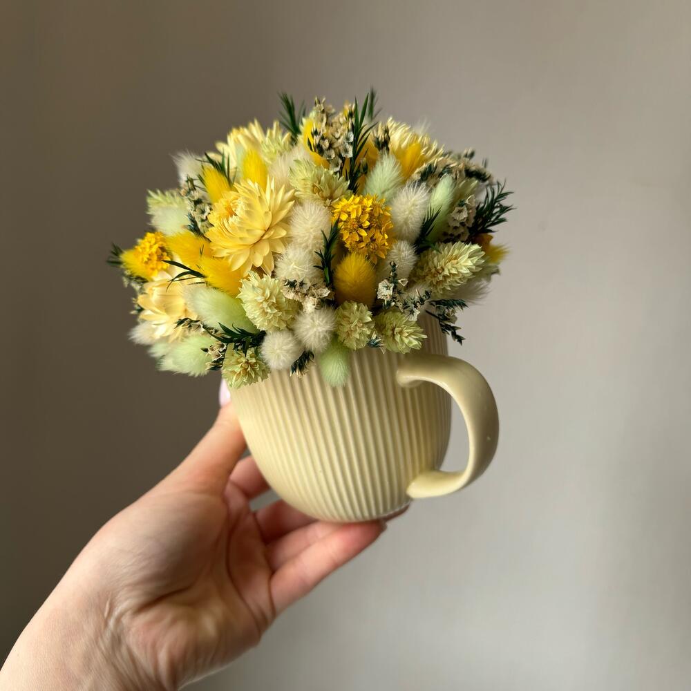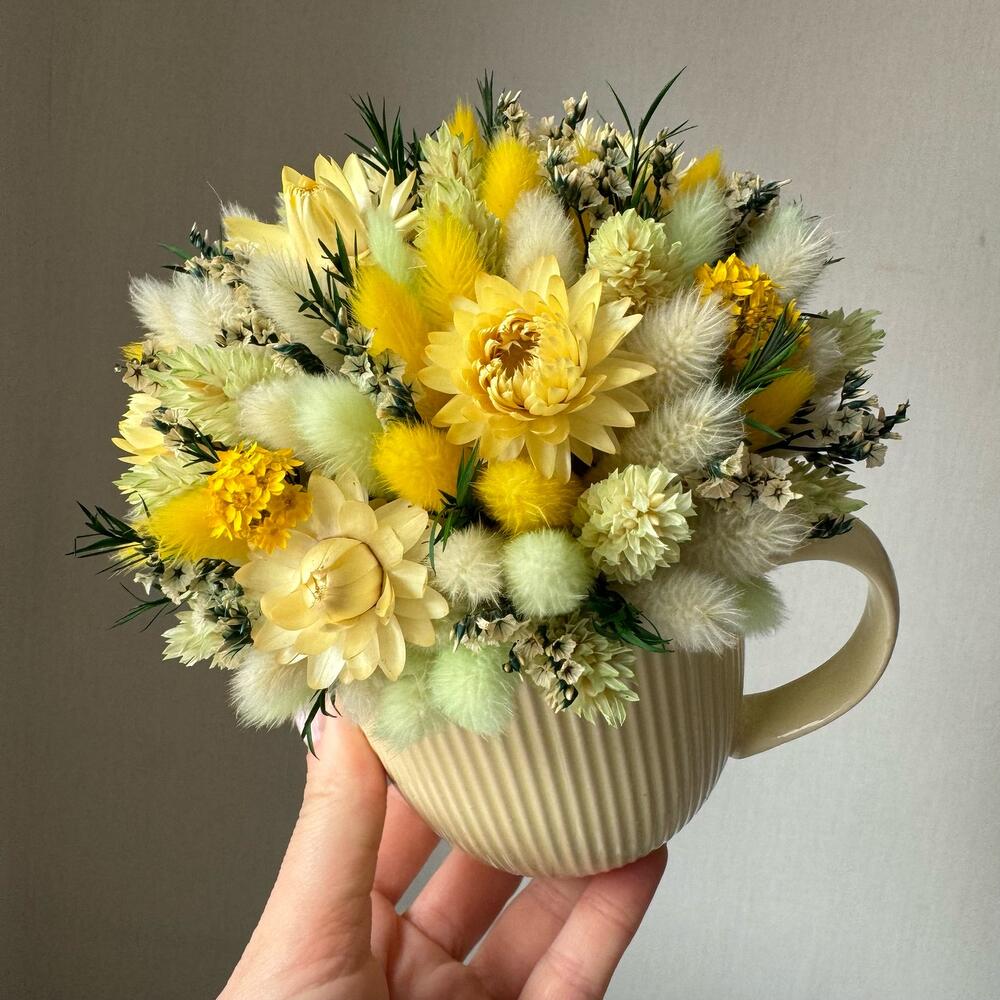 Милая кружка с солнечным набором сухоцветов и стабилизированных цветов. 🌱 собрана из натуральных цветов и растений, но в то же время не требует полива и она не завянет; 🌱 безопасна для людей и животных; 🌱 многолетняя и практически безуходная; 🌱 современный дизайн; На видео цвет немного искажается, при выборе ориентируйтесь пожалуйста на наши фото. Композиция доставляется красиво упакованной в подарочный пакет, с инструкцией по эксплуатации и не большым вкусным презентом.