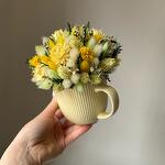 Фаларис - 25 шт. Гелихризум - 7 шт. Гелиптерум - 5 шт. кружка керамика - 1 шт. лимониум стабилизированный - 2 шт. чайное дерево стабилизированное - 3 шт. оазис сухоцвет - 1 шт. лагурус микс цвет - 83 шт.