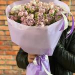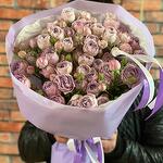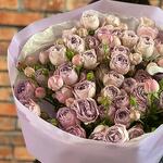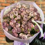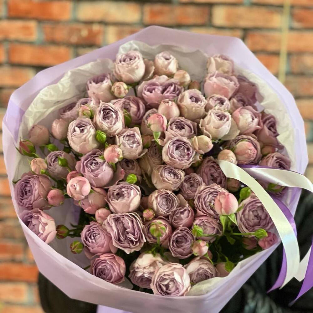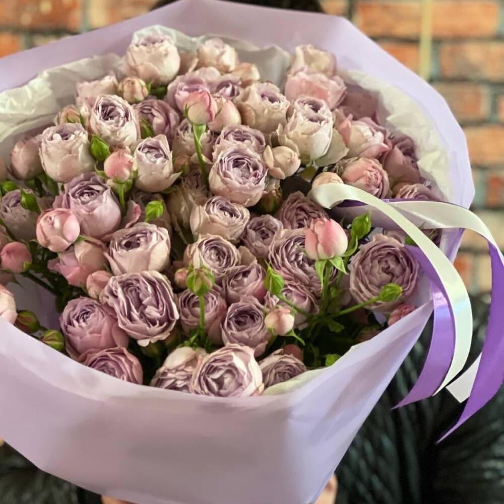 Атласная лента - 1 шт. Кустовая роза пионовидная - 9 шт. Пленка дизайнерская - 1 шт. открыточка - 1 шт.