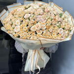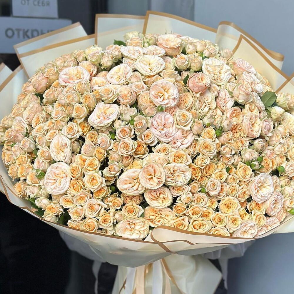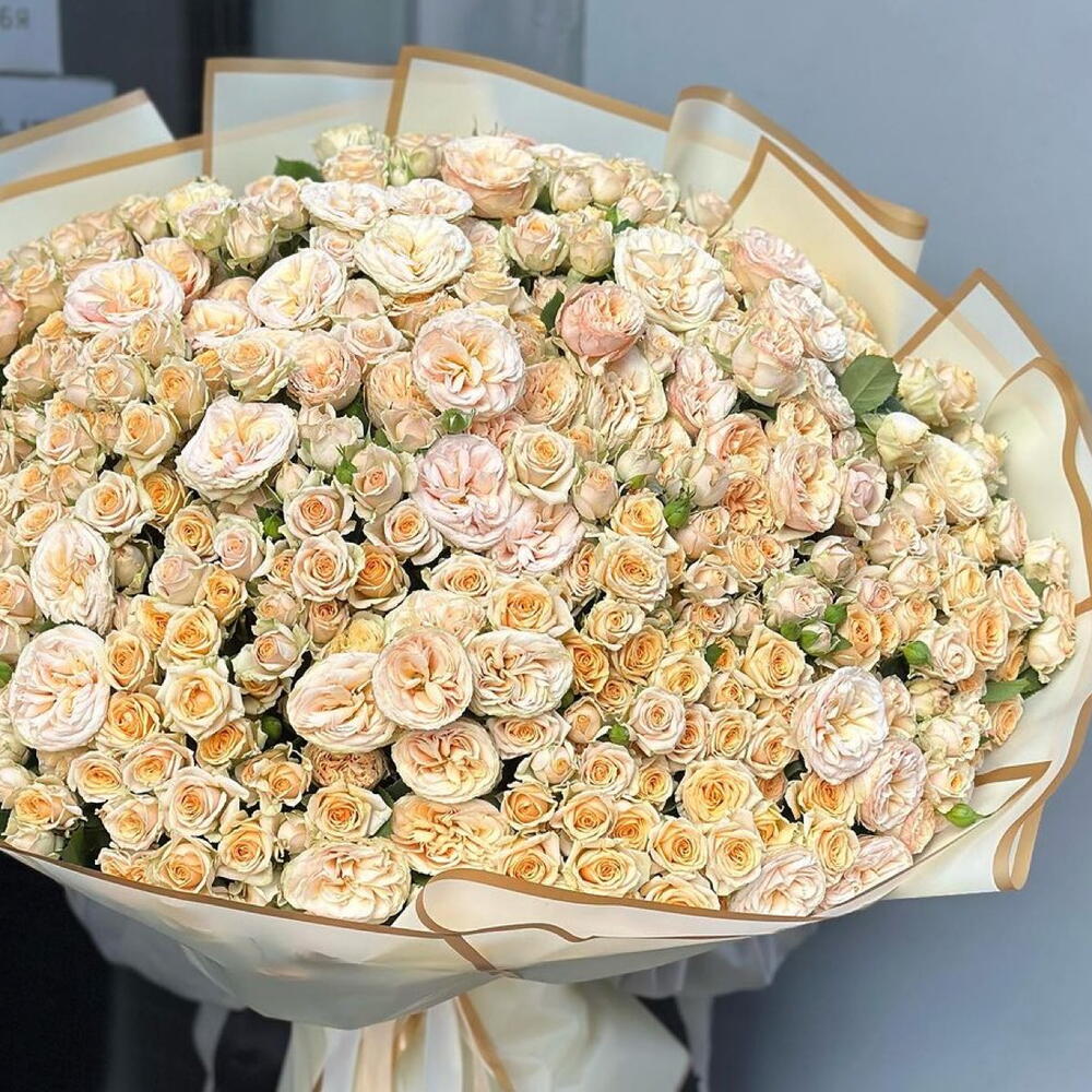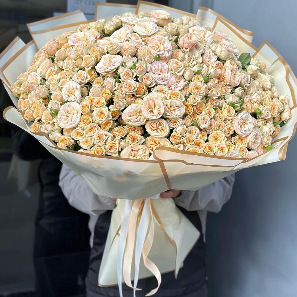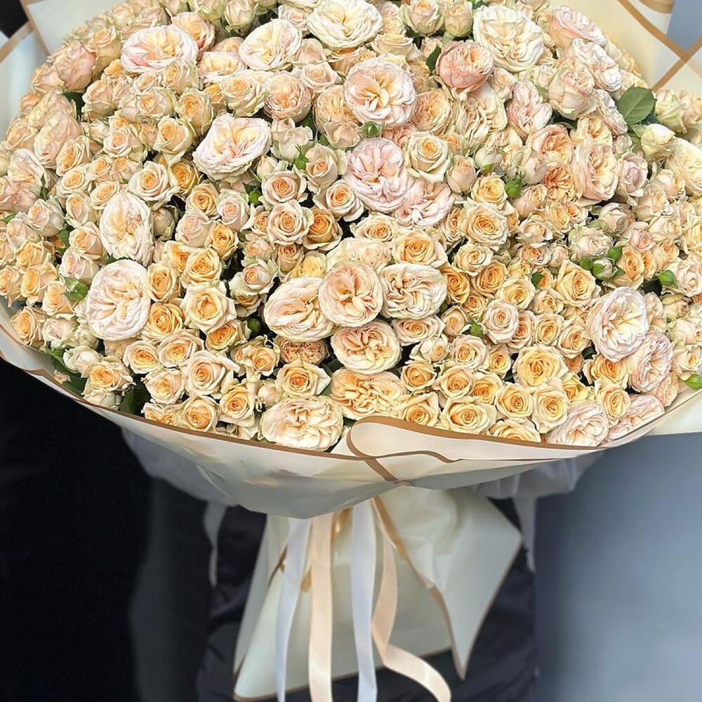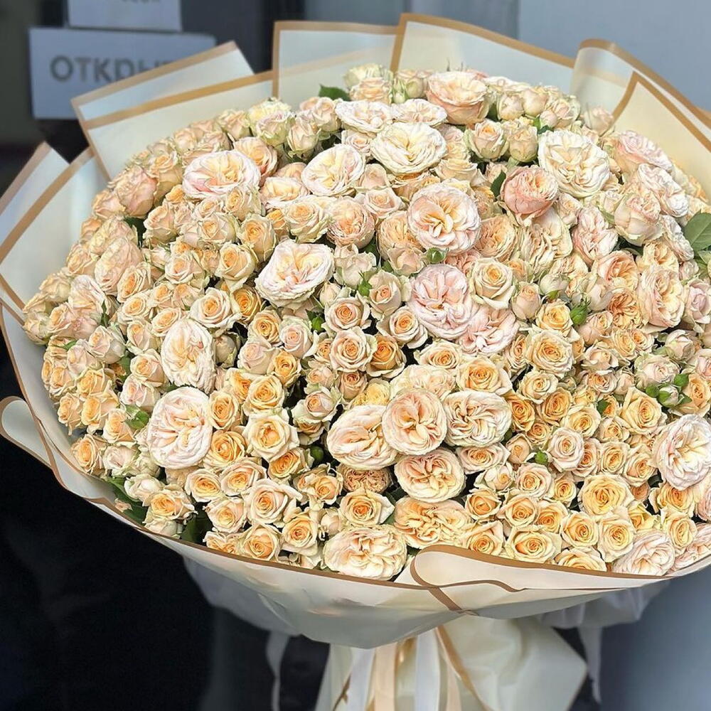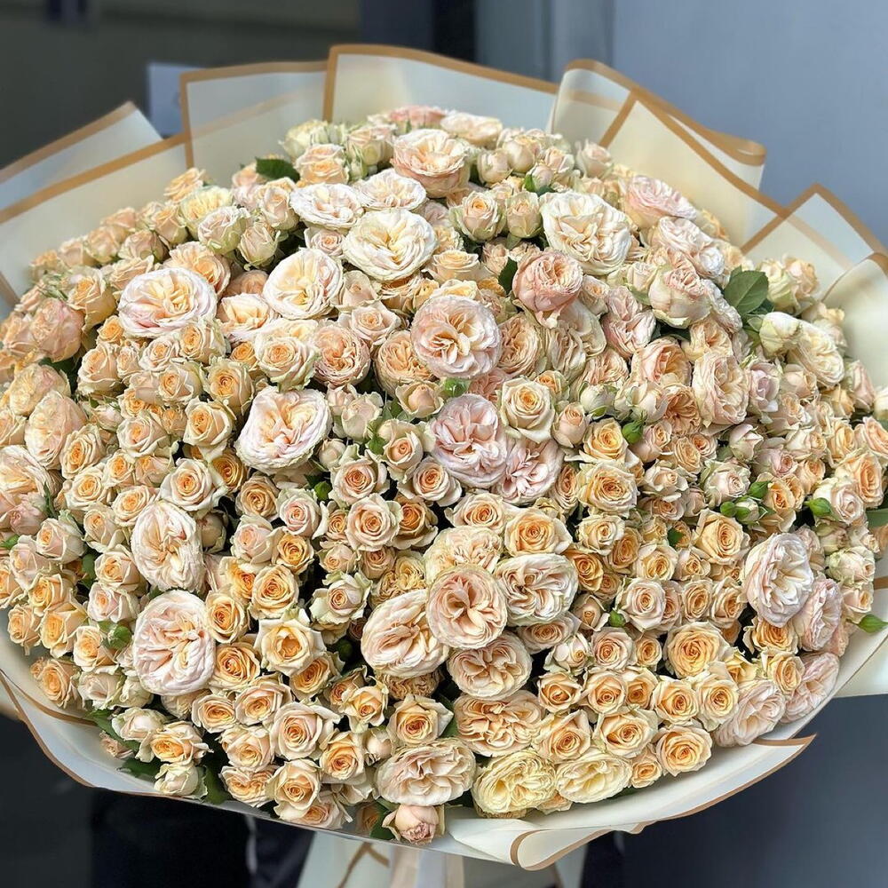 Кустовая роза - 59 шт. Лента атласная - 1 шт. Открыточка с вашими пожеланиями - 1 шт. Дизайнерское оформление - 1 шт.